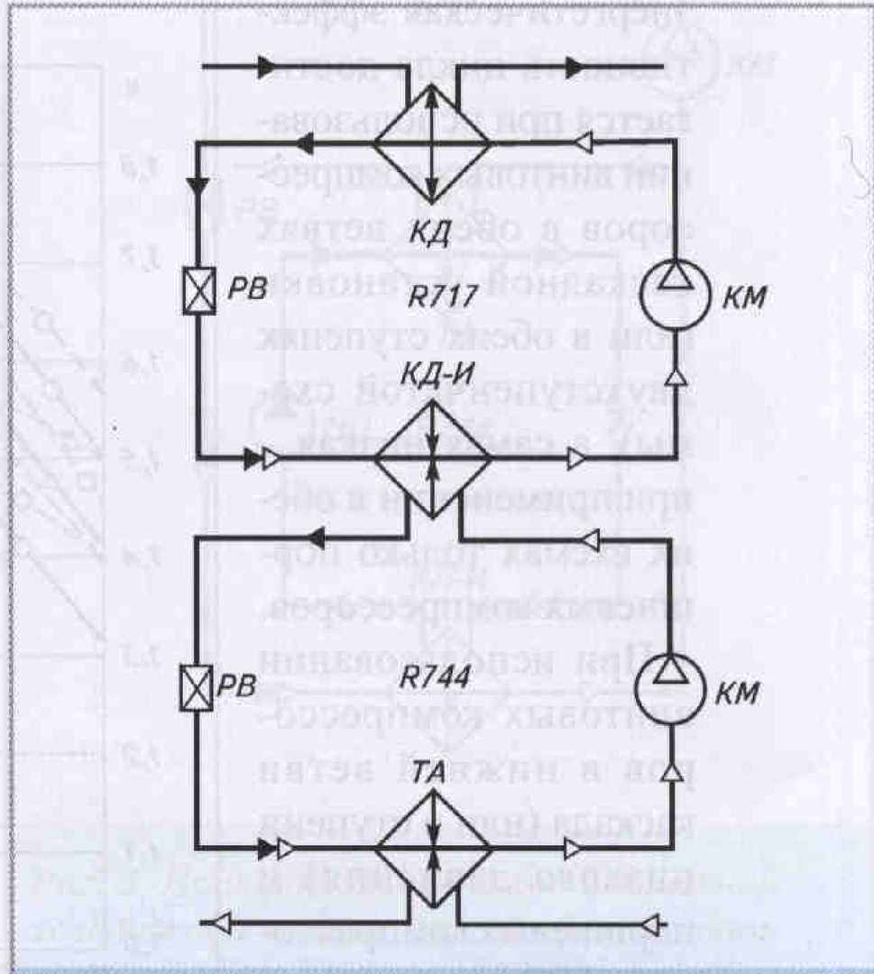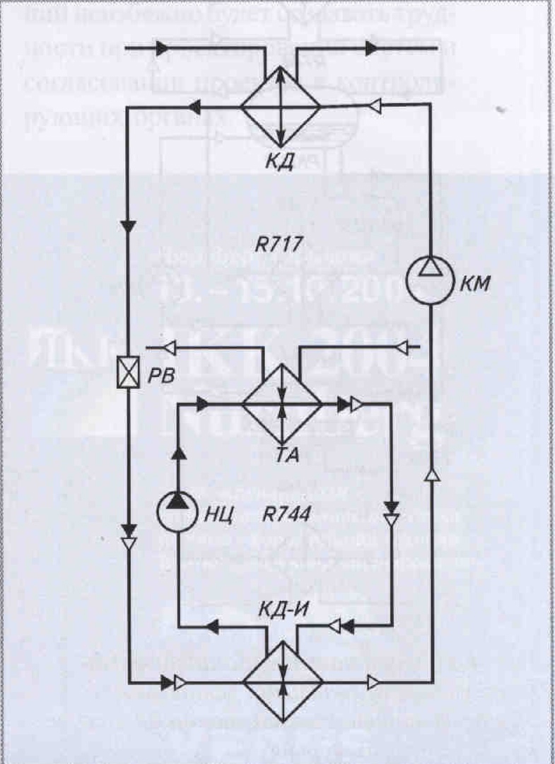 Рис. 3. Принципиальная схема аммиачной холодильной установки с использованием кипящего СО2, в качестве псевдохладоносителя: КМ -компрессор; КД -конденсатор; РВ регулирующий вентиль (дроссельное устройство); ТА -технологический аппарат (кипение СО2,); КД-И -конденсатор-испаритель (конденсация СО2, при кипении КН); НЦ -циркуляционный насос жидкого СО2