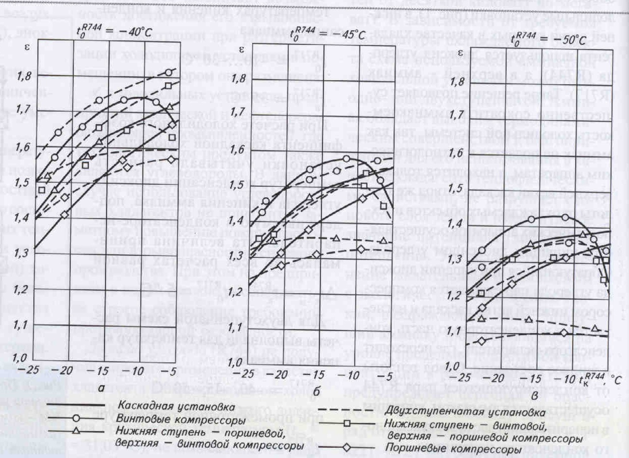 Расчеты показывают, что наиболее высокая энергетическая эффективность цикла достигается при использовании винтовых компрессоров в обеих ветвях каскадной установки (или в обеих ступенях двухступенчатой схемы), а самая низкая -при применении в обеих схемах только поршневых компрессоров.