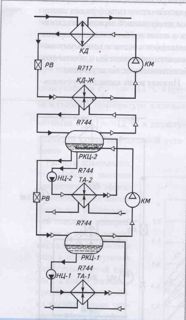 Другая часть жидкого диоксида углерода из компаундного ресивера РКЦ-2 забирается циркуляционными насосами НЦ-2 и направляется к охлаждающим приборам ТА2, отвод теплоты от которых также осуществляется диоксидом углерода, кипящим при температуре г02= -10...-12°C. Полученная парожидкостная смесь диоксида углерода после охлаждающих приборов возвращается в компаундный ресивер РКЦ-2.