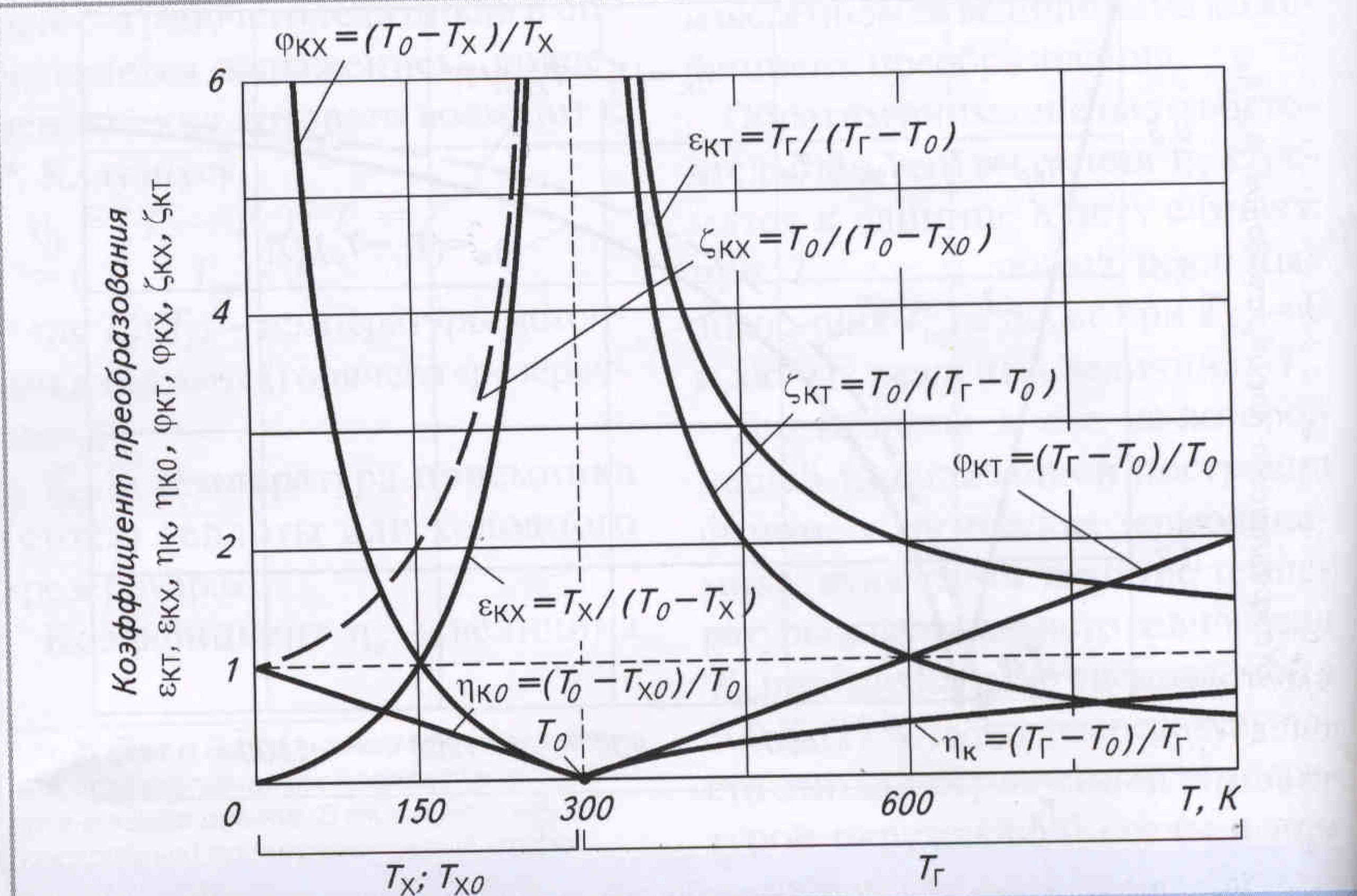 Обратная величина (ф^=<р„= = (Тг — Го)/Го — отношение затраченной мощности к перенесенной тепловой мощности при То, Вт/Вт — определяет величину минимально необходимой затраты энергии для переноса теплоты с температурного уровня То на уровень Тг. Понятно, что при Тт → Т0 величина фкт стремится к нулю. При температуре более 600 К коэффициент фкт принимает значение больше единицы. Эта ситуация отражена на рис. 2.