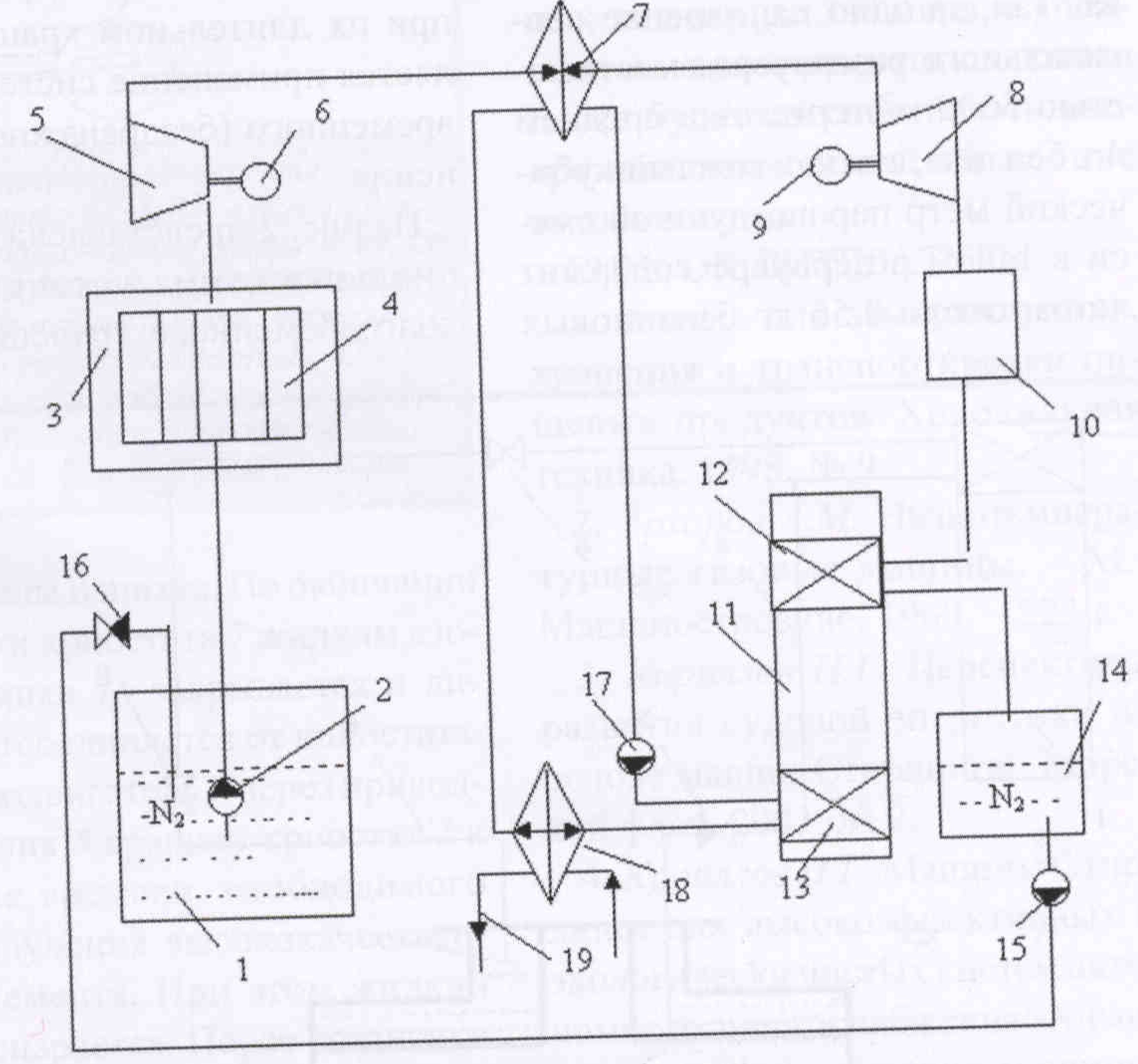 Рис. 1. Автономная замкнутая система азотного охлаждения для термостатирования объектов с одновременной выработкой электроэнергии: азотный контур: 1 — емкость с жидким азотом; 2 — погружной центробежный насос; 3 — теплоизолированный охлаждаемый объем; 4 — воздухоохлаждающая панель; 5 — расширительная турбина высокого давления; 6 — электрогенератор на одном валу с турбиной; 7 — теплообменник подогрева азота; 8 — расширительная турбина низкого давления; 9 — электрогенератор; 10 — расширительная емкость; 11 — криогенная холодильная машина Стирлинга; 12 —конденсатор КХМ; 13 — холодильник КХМ; 14 — сосуд Дьюара; 15 — насос высокого давления; 16 — обратный клапан. Контур охлаждения криогенной машины: 17 — насос; 18 — теплообменник; 19 — трубопроводы