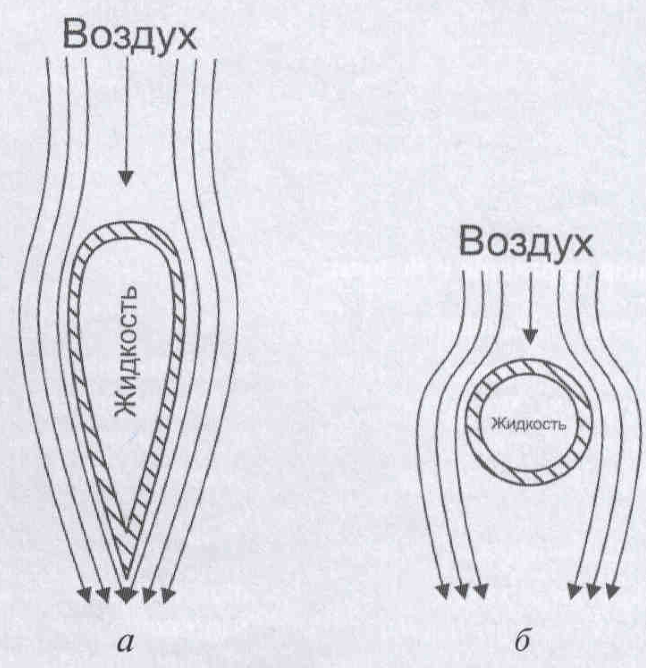 Рис. 1. Схема обтекания воздуха вокруг теплообменных элементов: а — труба каплеобразного сечения; б — труба круглого сечения