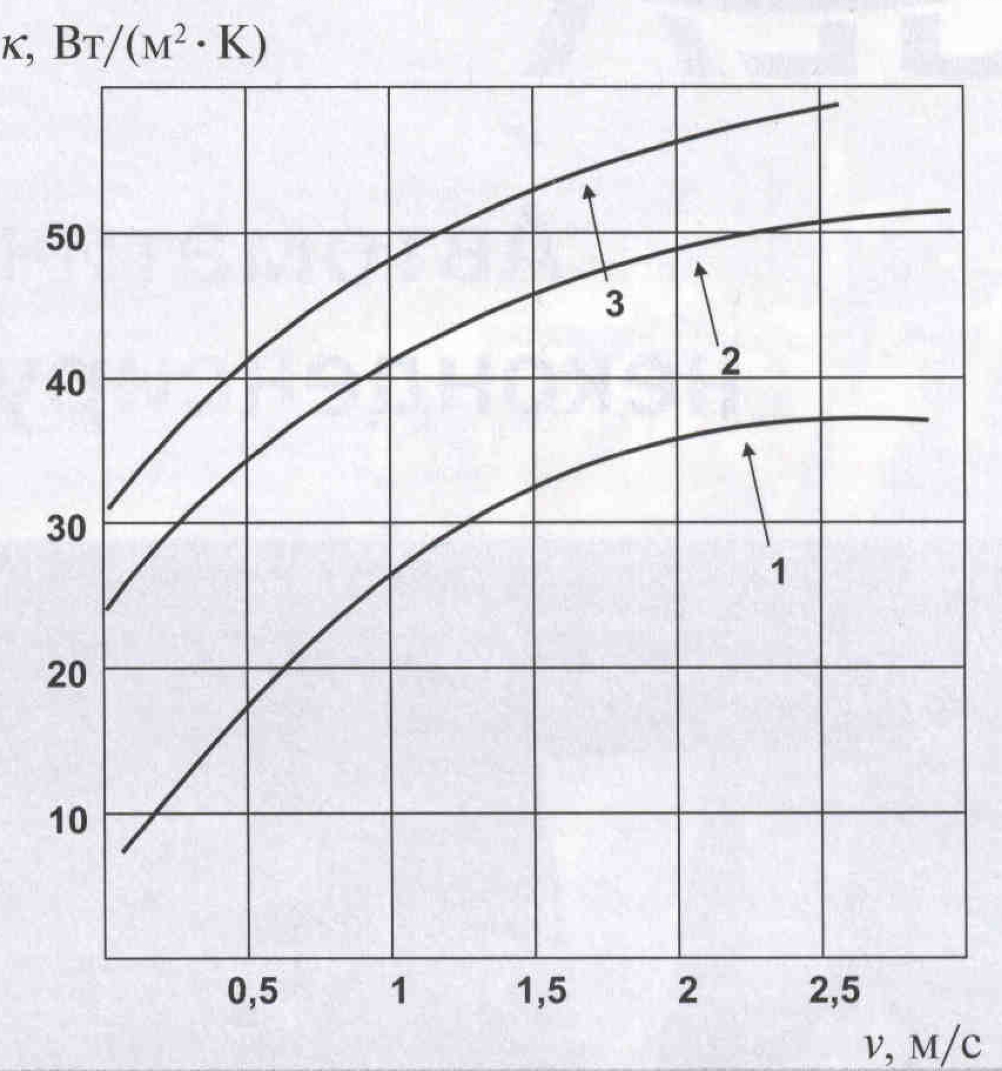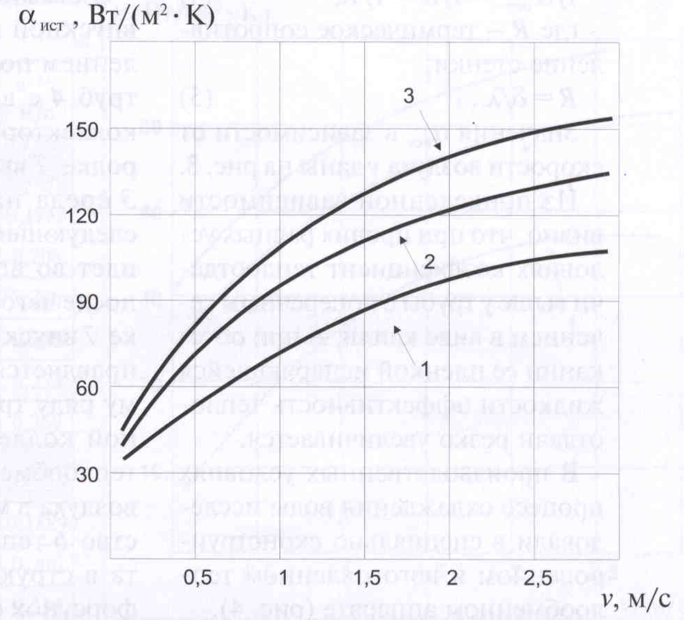 Рис. 3. Зависимость истинного коэффициента теплоотдачи от поверхности ТЭ к охлаждающей среде от скорости воздуха: 1 - цилиндрическая труба; 2 - каплеобразная труба; 3 - каплеобразная труба с орошением водой
