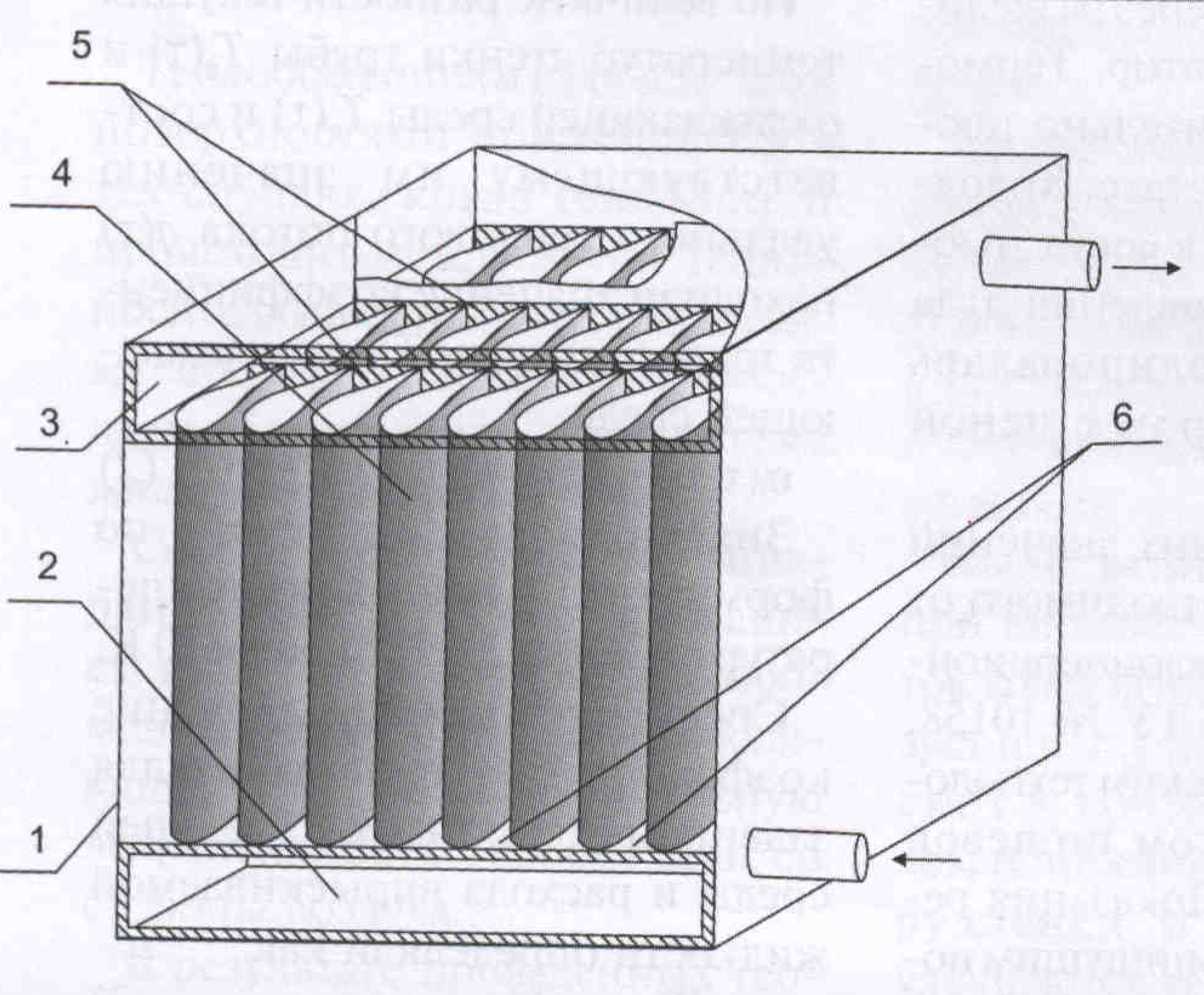 Рис. 4. Теплообменный аппарат:1 - корпус; 2 - впускной коллектор; 3 - выпускной коллектор;4 — трубы; 5 — сетчатые пластины; 6 — межтрубное пространство