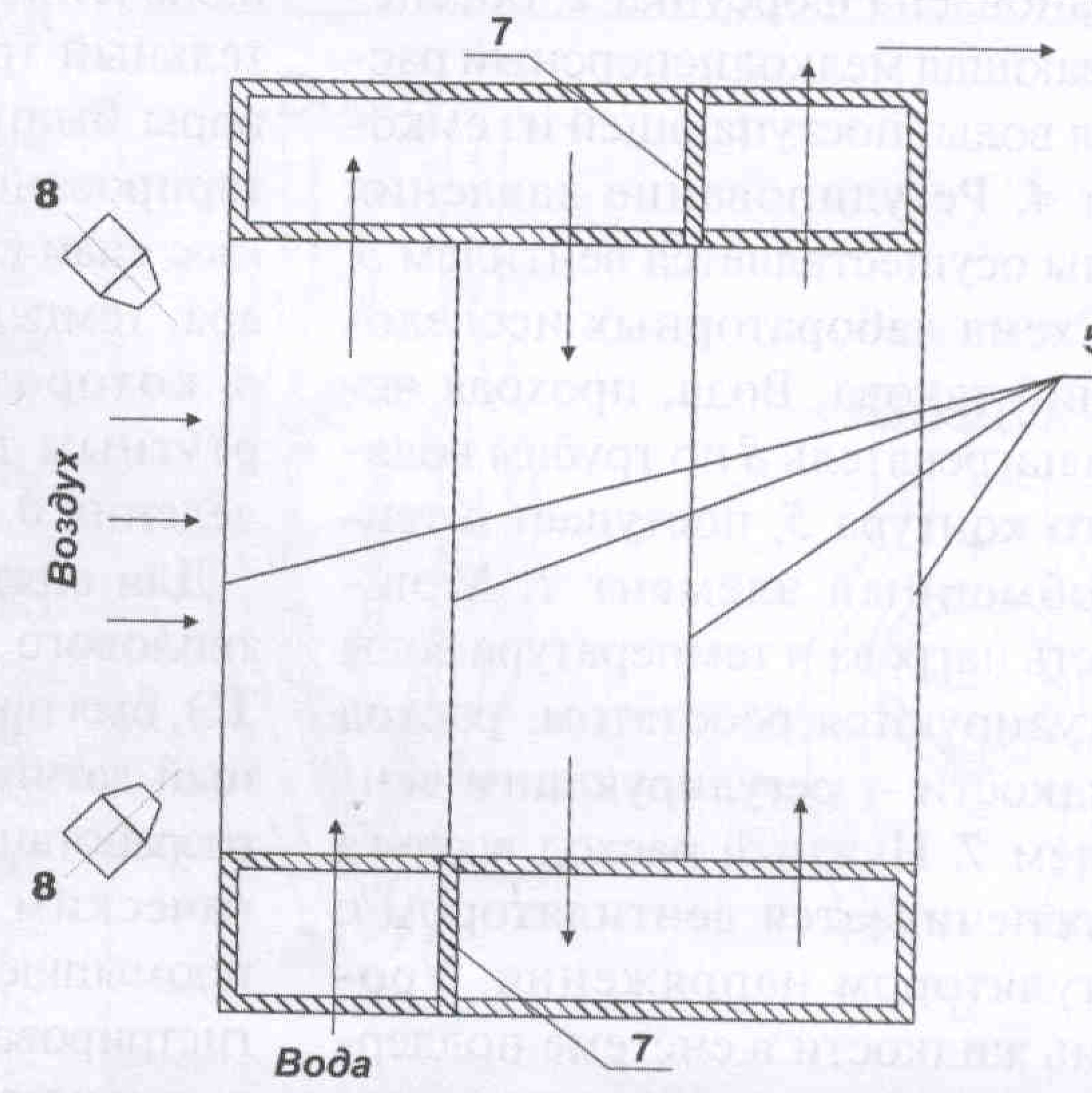 Рис. 5. Схема движения охлаждающей среды:5 — сетчатые пластины; 7 — перегородки коллектора;8 — форсунка
