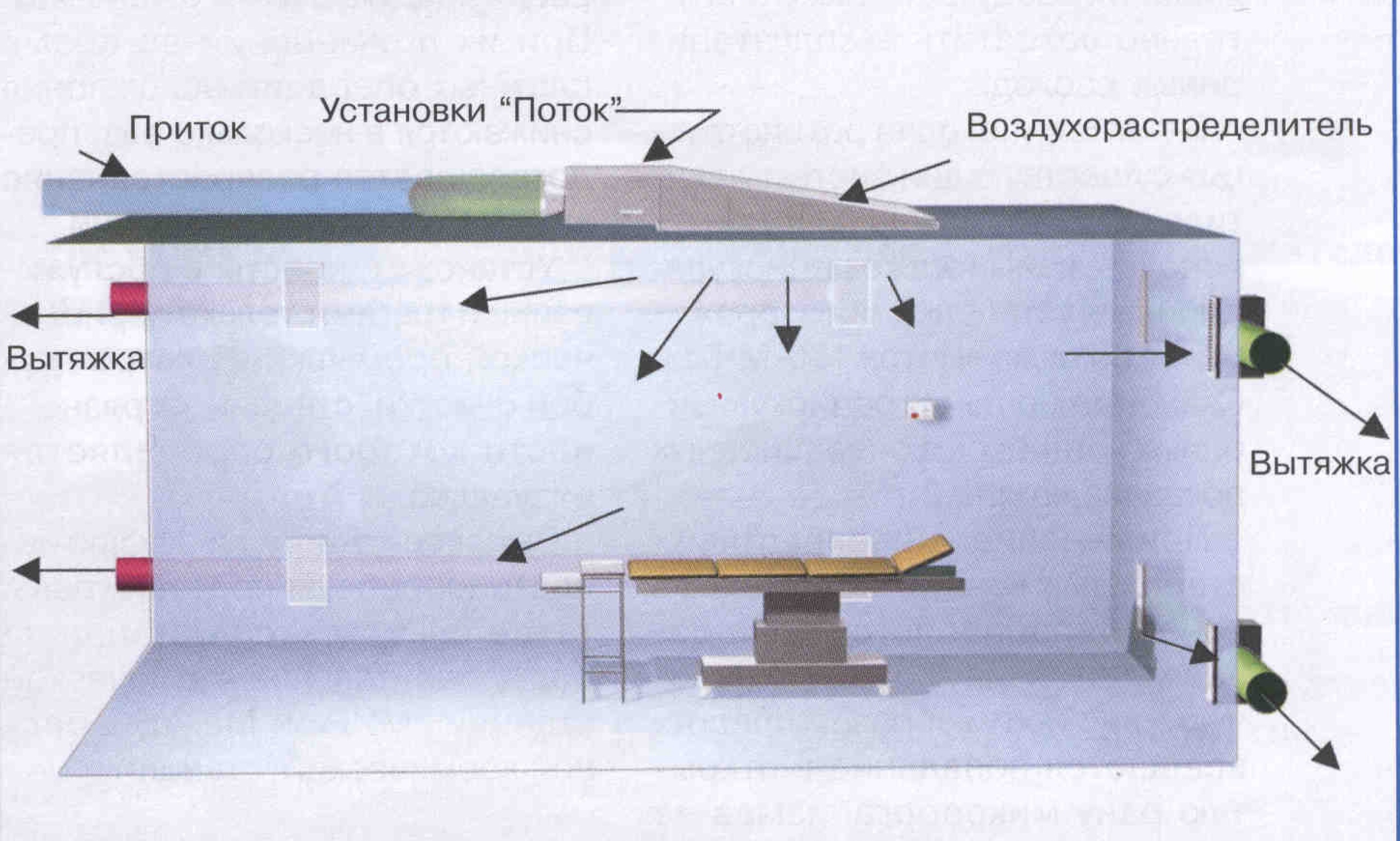 NPF «Potok-Inter» has developed a new technology for decontamination and filtration of air of operating theaters with full inactivation of microorganisms and viruses under the action ofconstant electric fields ofpredetermined orientation and intensity. The installation «Potok-150-M-01» based on it, with a ceiling air distributor supplies the conditioned air of the required to the operating theater, and the recirculating installations «Potok-150-М-О!» clean zones near operating and instrument tables. The installations were also used on board the orbit cosmic station «MIR».