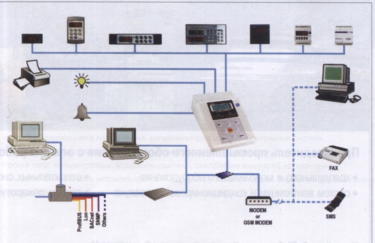 К блоку мониторинга в нашем конкретном случае были подключены два электронных контроллера холодильных установок, десять блоков контроля температуры в камере, а также GSM-модем и локальный компьютер. Через GSM-модем осуществлялась связь с удаленным компьютером, а также передача факсимильных сообщений и SMS-сообщений на мобильный телефон.