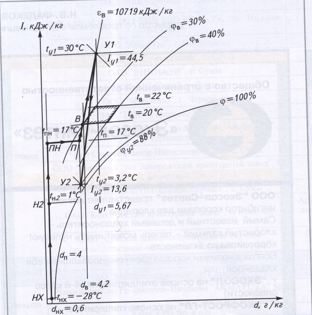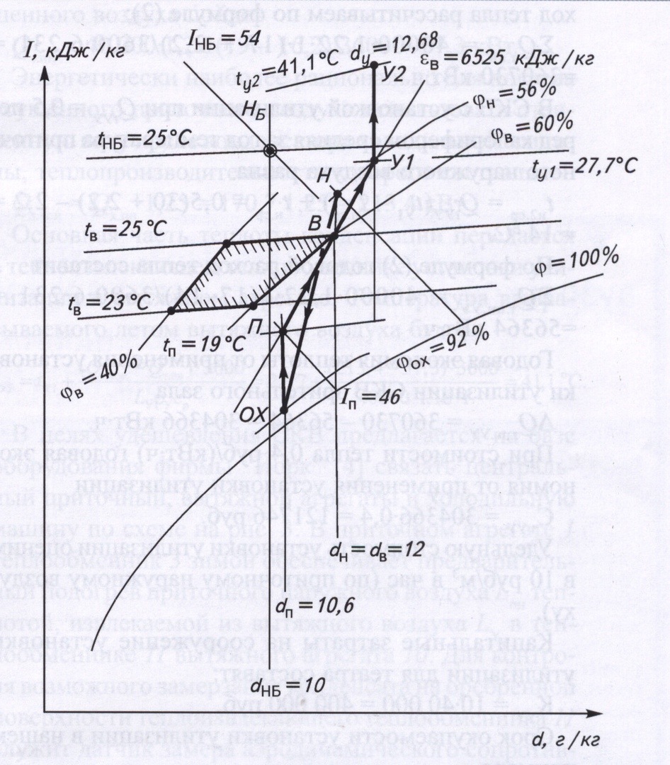 По прежним нормам (точка ЯБ) можно было осуществлять охлаждение приточного наружного воздуха при постоянном влагосодержании, так как требуемое влагосодержание приточного воздуха dп = 10,6>dнб = 10 г/кг. Такой режим потребления холода является энергетически наиболее эффективным.