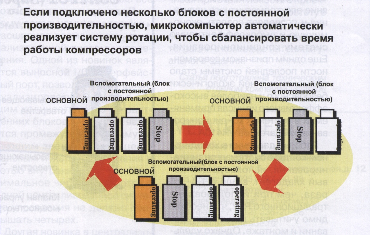 Благодаря новой системе управления работой наружных блоков, использующей принцип автоматической очередности (или ротации), наружные блоки с компрессорами PC имеют равномерную наработку, что увеличивает общий ресурс системы и повышает ее надежность.