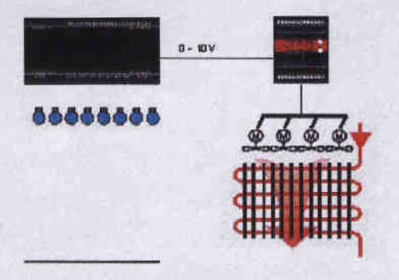 В случае если имеющихся в контроллере выходов недостаточно, то при помощи аналогового выхода 0-10 В можно подключить один или два контроллера ЕКС 331Т, работающих как релейные модули, и тем самым получить дополнительно четыре или восемь ступеней регулирования производительности конденсатора (рис. 3). Для бесступенчатого управления производительностью конденсатора сигнал с аналогового выхода подается на частотный преобразователь, что позволяет осуществлять точное поддержание давления/температуры конденсации и существенно снизить энергопотребление вентиляторов (рис. 4).
