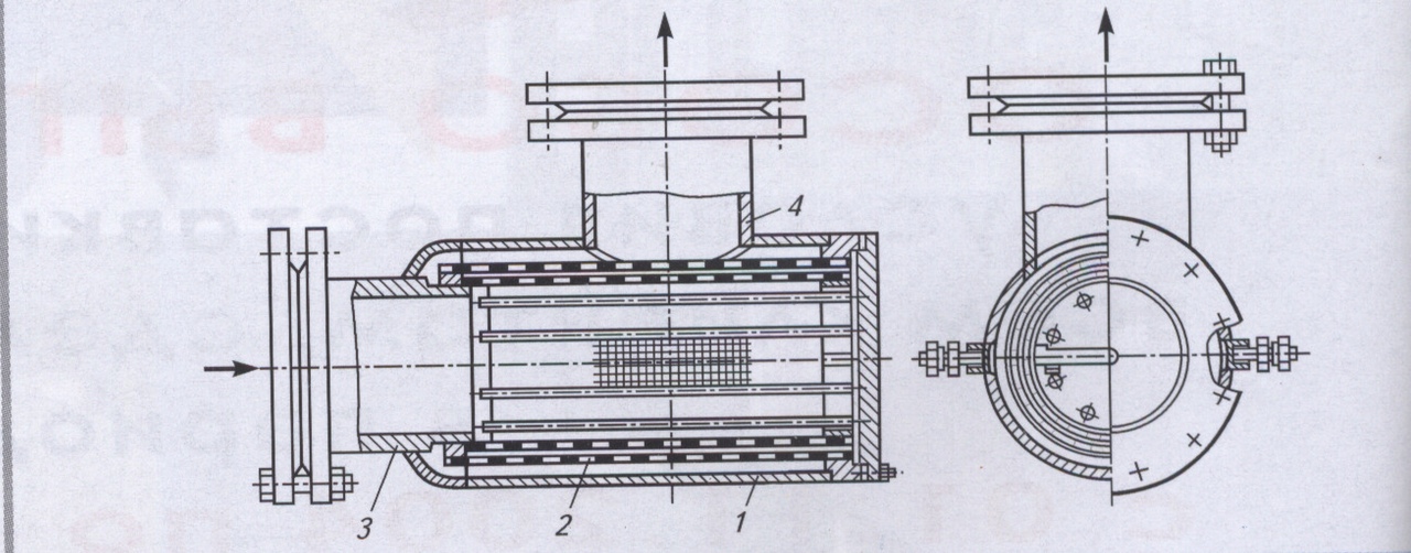 Рис. 1. Паровой механический поверхностный сетчатый фильтр: 1 — корпус; 2 — фильтрующий элемент; 3, 4 — подводящий и отводящий патрубки