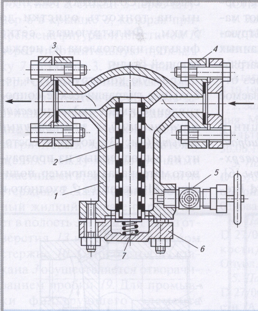 Конструкция типового гидравлического механического поверхностного сетчатого фильтра для аммиачных парокомпрессионных холодильных машин показана на рис. 2. В корпусе 7 с подводящим 4 и отводящим 3 патрубками для хладагента установлен сетчатый фильтрующий элемент 2, прижимаемый пружиной 7. На запорном вентиле 5устанавливают манометр. Для очистки фильтрующего элемента 2 от задержанных механических примесей (загрязнений) его вынимают через отверстие в корпусе 7, закрываемое крышкой 6.