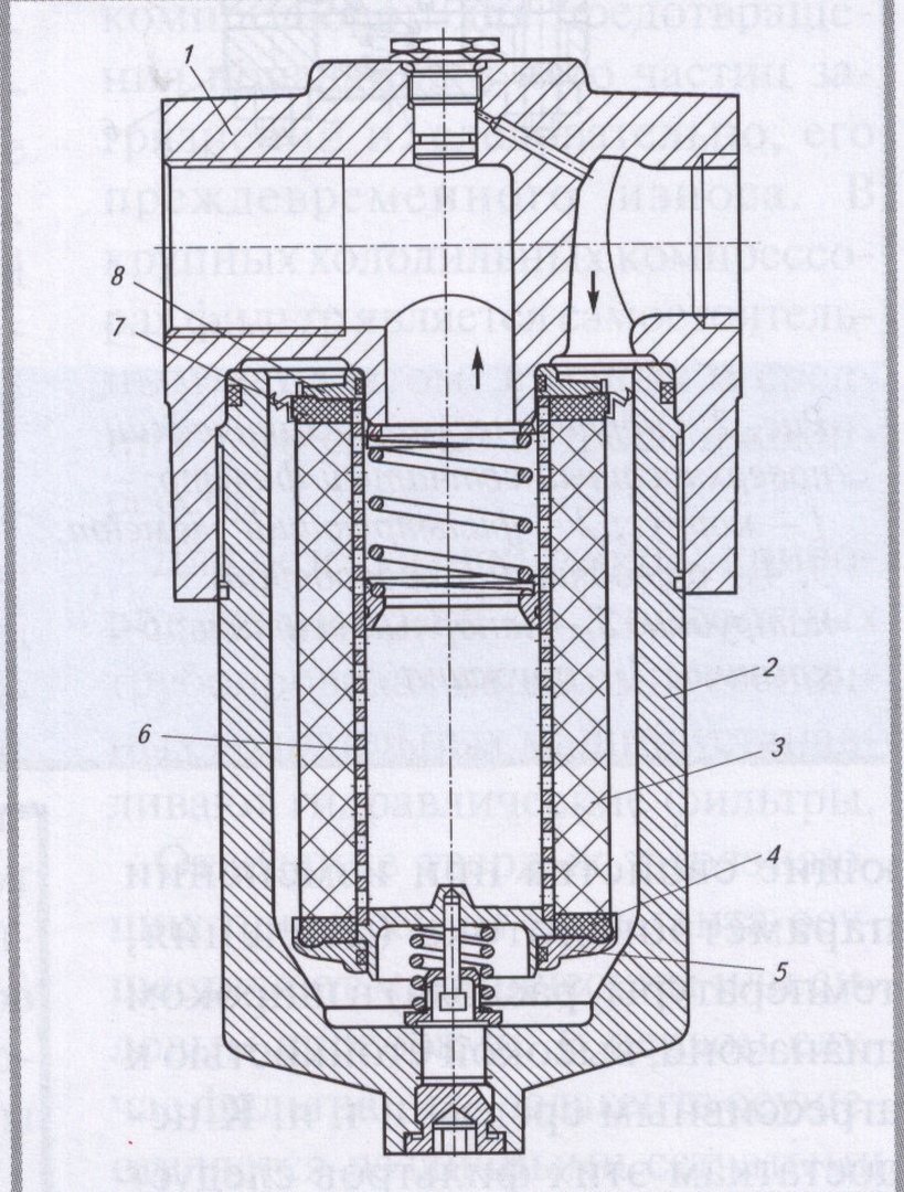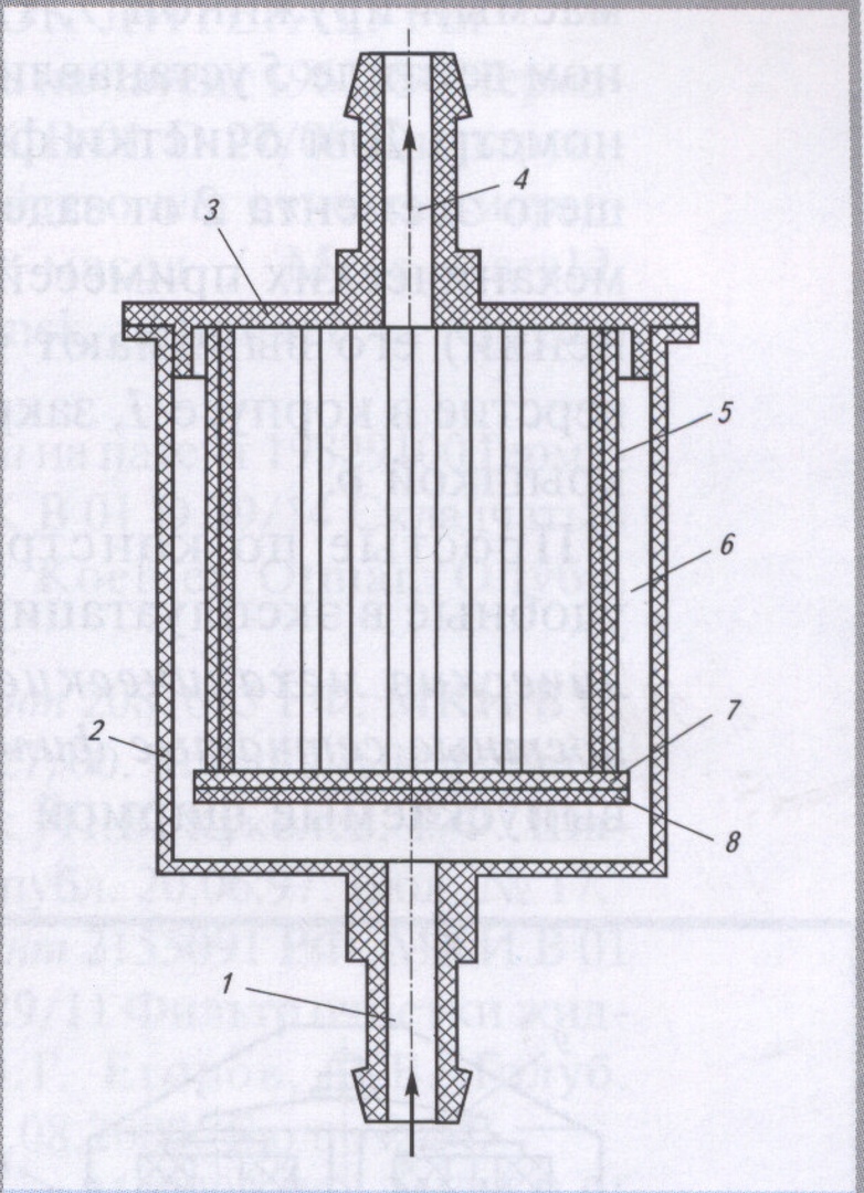 Рис. 6. Гидравлический механический фильтр отстойного типа с фильтрующим элементом:1 — корпус; 2 — стакан-отстойник; 3 — фильтрующий элемент; 4,7 — уплотнительные кольца; 5, 8— опорные шайбы; 6 — решетчатая труба