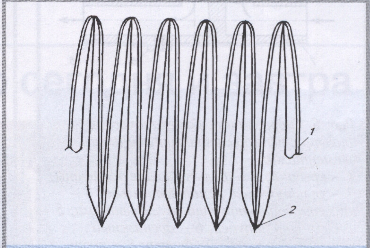 Рис. 4. Гидравлический механический поверхностный фильтр с многослойным фильтрующим элементом складчатого типа:1 — фильтрующий элемент из нетканого сетчатого материала; 2 — металлический стержень
