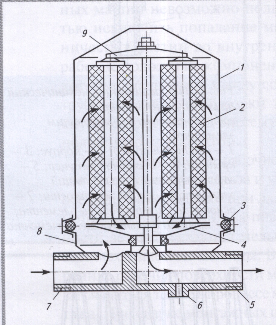 Рис. 5. Гидравлический механический фильтр с четырьмя фильтрующими элементами:1 — крышка; 2 — фильтрующие элементы; 3 — уплотняющее резиновое кольцо; 4 — кассета с фильтрующими элементами; 5 — выходной штуцер; 6 — дренажный штуцер; 7 — входной штуцер; 8 — корпус; 9 — коромысло