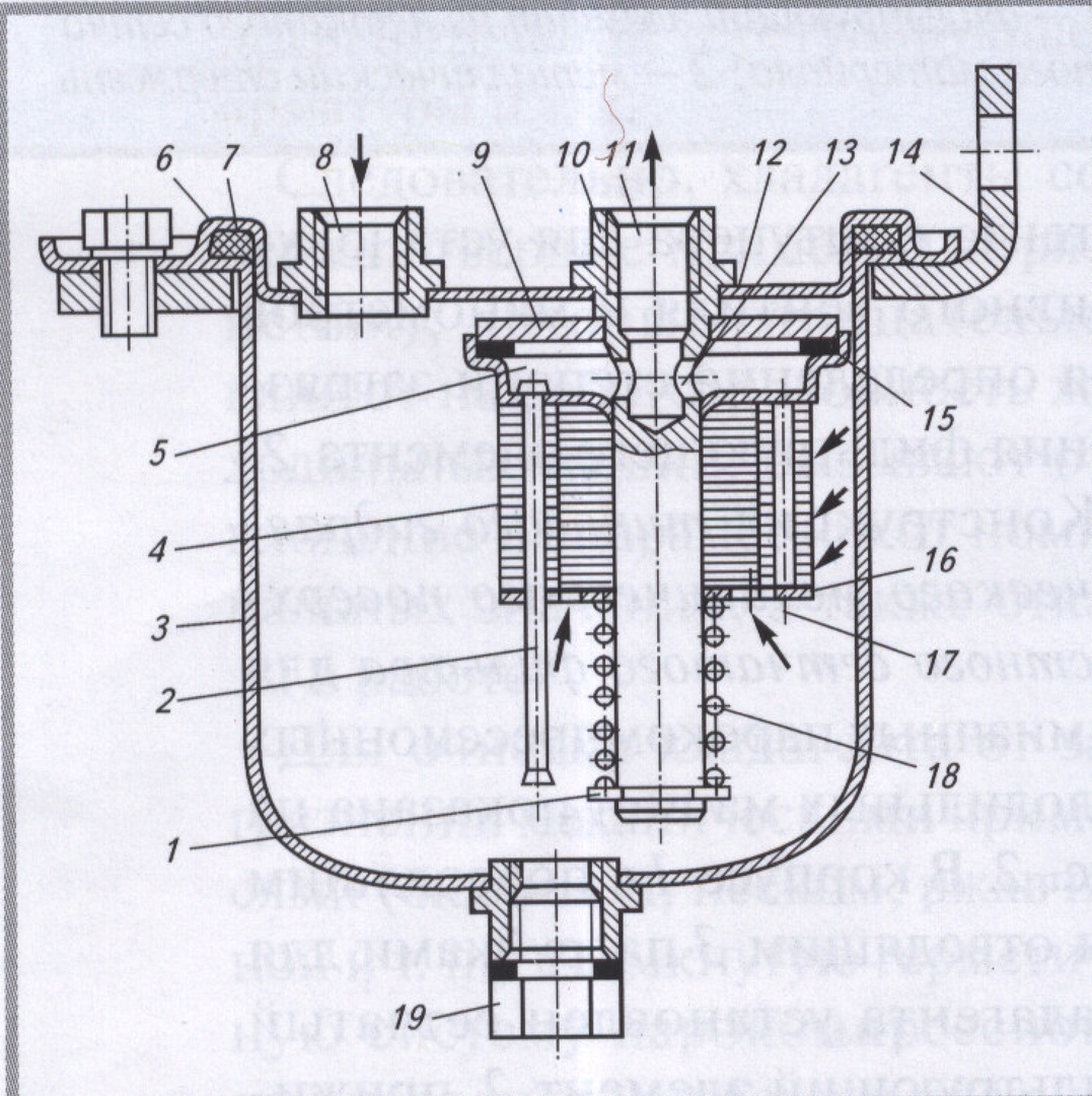 Рис. 7. Гидравлический механический щелевой фильтр отстойного типа: 1 — замковая шайба; 2 — стержни; 3 — стакан; 4 — фильтрующие пластины; 5 — полость отфильтрованного хладагента; 6 — крышка; 7 — уплотнительная прокладка; 8 — входной штуцер; 9 — верхняя опорная пластина фильтра; 10 -центральный стержень; 11 — выходное отверстие; 12 — выступ центрального стержня; 13 — отверстия для выхода хладагента; 14 — фигурная пластина; 15 — уплотнение; 16— нижняя опорная пластина; 17-периферийные отверстия в нижней опорной пластине; 18 — пружина; 19 — пробка