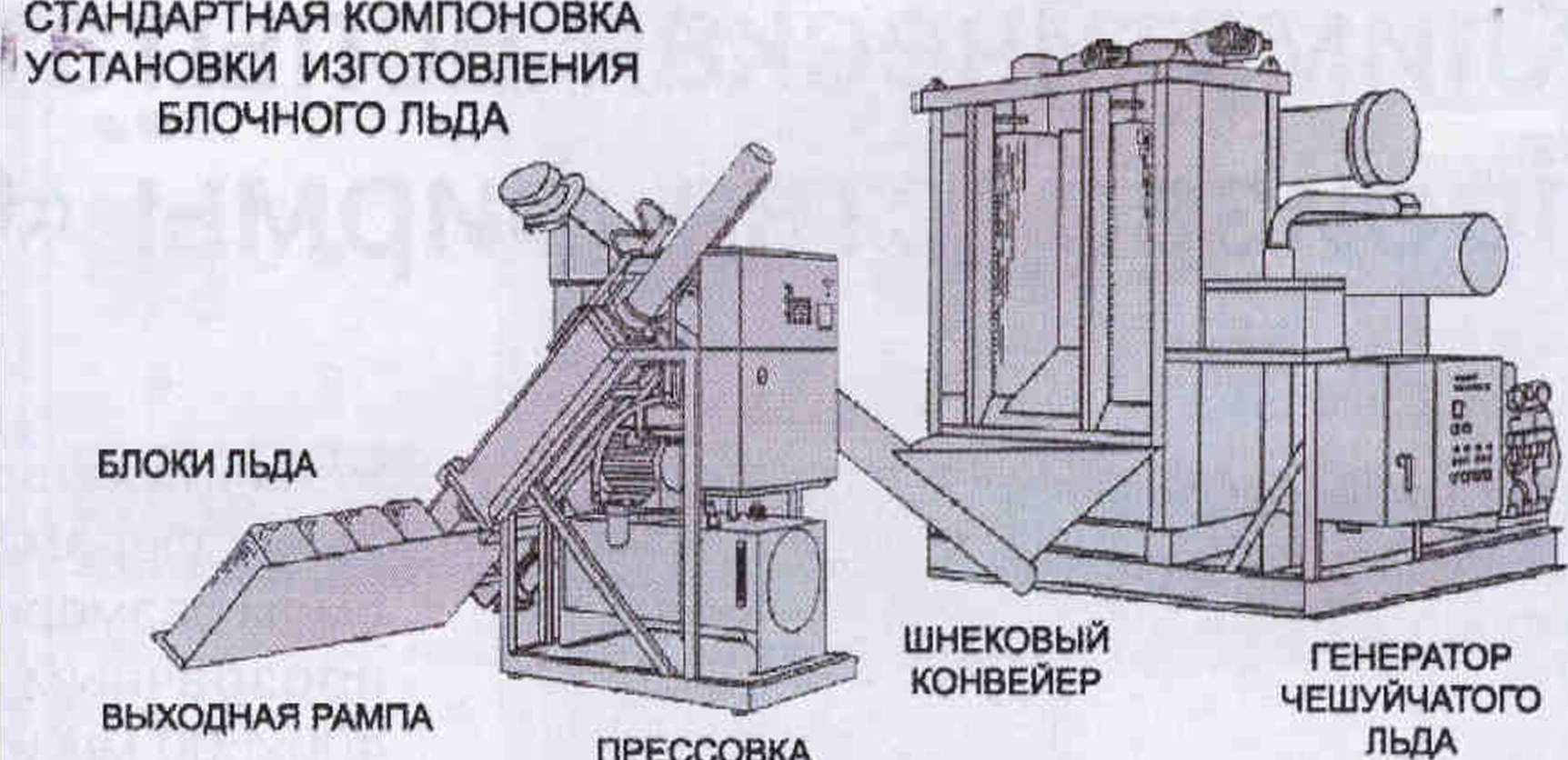 Интересным направлением работ завода Йорк-Дания являются аппараты и установки по производству льда. Компания выпускает и поставляет как отдельные льдогенераторы, так и комплектные заводы производительностью 4...60 т чешуйчатого льда в сутки и до 40 т блочного льда в сутки (рис. 4). Лед применяется в технологических процессах на мясокомбинатах, при хранении и транспортировке рыбы и морепродуктов, а также при приготовлении бетонных смесей в строительстве.
