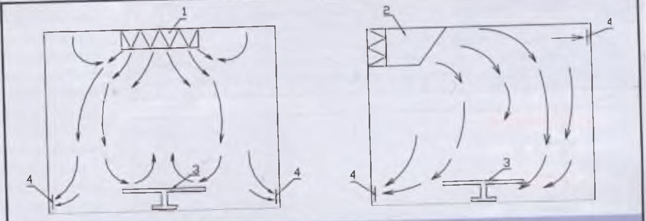 Рис. 17.8. Вентилирование помещения турбулентными потоками воздуха:1. Потолочный воздухораспределитель, совмещенный с высокоэффективным фильтром. 2. Пристенный воздухораспределитель. 3. Технологическое оборудование (операционный стол). 4. Вытяжные решетки