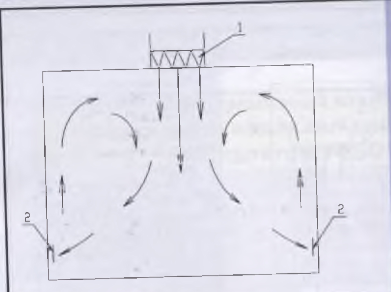 Рис. 17.9. Схема движения потоков при струйной подаче воздуха: 1. Фильтр. 2. Вытяжные решетки