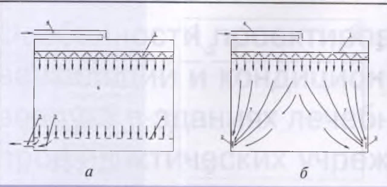 В ультрастерильных операционных с классом чистоты 10 или 100 применяется так называемая “потолочная” вентиляция турбулентными или слаботурбулентными потоками (рис. 17.10). Очищенный воздух поступает в приточную камеру 3, расположенную в подшивном потолке. Далее воздух проходит через стабилизатор струи, представляющий собой сопло, установленное под углом к потоку, поступающему из приточной камеры, и перфорированные панели в помещение и удаляется через вытяжные устройства, расположенные в верхней и нижней зонах стены.