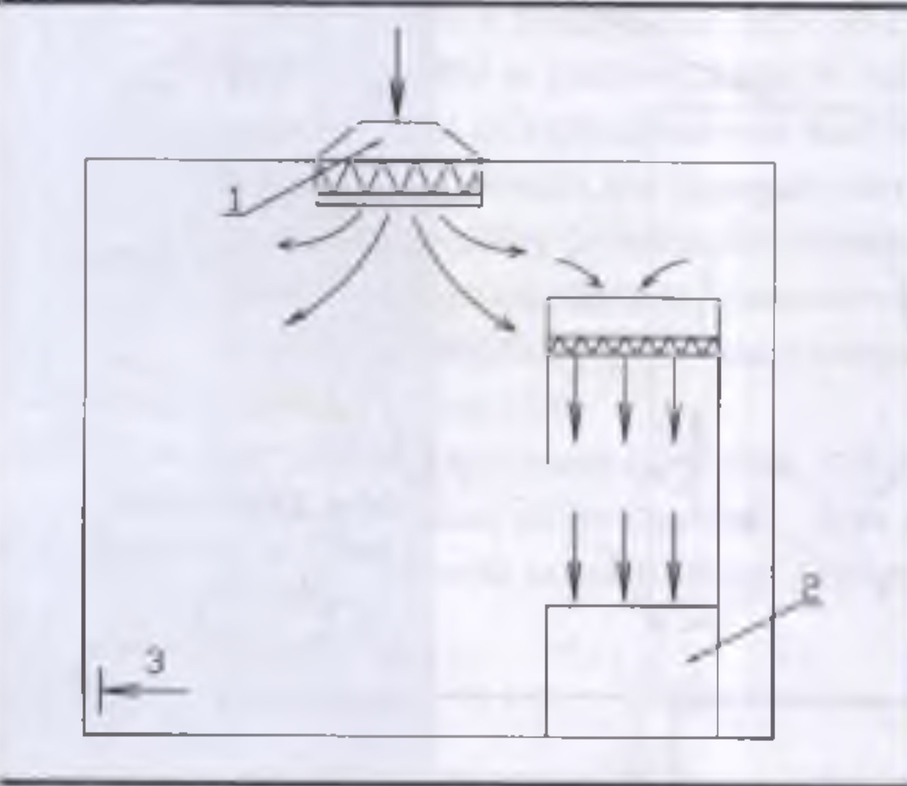 Рис. 17.13. Помещение с турбулентными потоками и установкой “ламинарного ” шкафа:1. Воздухораспреде­литель турбулентно­го потока. 2. Шкаф с “ламинарным ” потоком. 3. Вытяж­ное устройство