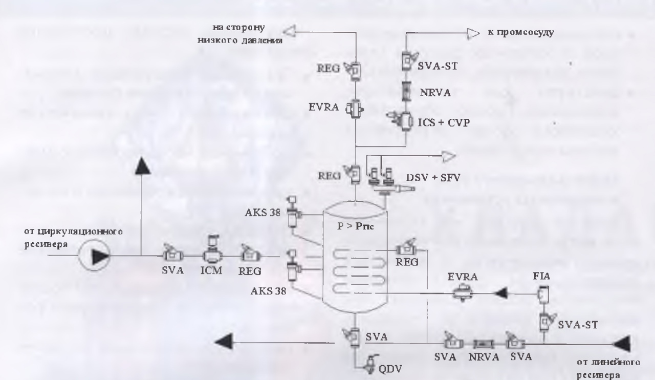 В промышленных аммиачных холодильных установках вода удаляется с помощью ректификаторов, в которых испаряется аммиак, оставляя воду на дне сосуда. При многократном повторении данного процесса отстой, оставшийся после выпаривания аммиака, удаляется из ректификатора. Обычно отстой представляет собой воду с содержанием аммиака около 30-40 %, в зависимости от давления и температуры выпаривания. Схема ректификатора по удалению воды из аммиачной установки представлена на рис. 2. Жидкий аммиак после заполнения резервуара, в котором поддерживается давление чуть выше, чем в промсосуде, и закрытия моторного клапана ICM в парообразном состоянии отсасывается на сторону низкого давления. После достижения установленного давления чуть выше, чем в промсосуде, происходит открытие сервоприводного клапана ICS с одновременным закрытием соленоидного вентиля EVRA на линии низкого давления. Открывается подача жидкого аммиака в змеевик со стороны высокого давления соленоидным вентилем EVRA на линии от линейного ресивера, а после выпаривания аммиачной составляющей из резервуара на сторону промсосуда вода с примерным содержанием аммиака около 30-40 % сливается через вентиль QDV.