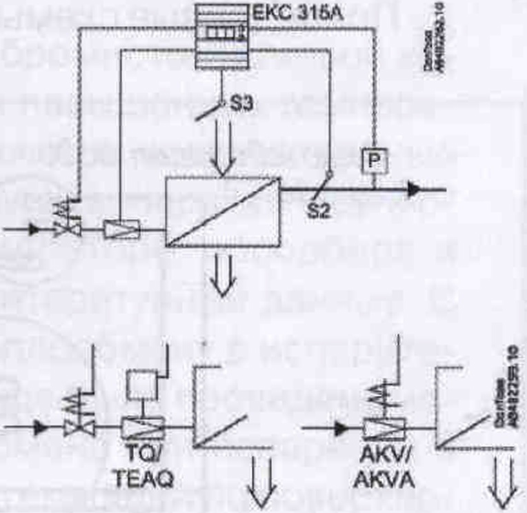 Контроллер ЕКС 315А (рис. 7, 8) применяется для управления испарителями в промышленных холодильных установках. Он может быть использован в чиллерах, воздухоохладителях, тепловых насосах, управляя импульсными расширительными вентилями серии AKV и электроприводными вентилями серии TQ (рис. 9). При применении расширительных вентилей AKV к контроллеру можно подключить два ведомых контроллера ЕКС 347, если не хватает производительности одного расширительного вентиля или необходимо снизить пульсации давления в трубопроводе. Для систем с малой заправкой хладагентом не рекомендуется использовать импульсный расширительный вентиль. В подобных системах применяется электроприводный расширительный вентиль с плавным изменением степени открытия серии TQ. Примером такой системы может быть чиллер с пластинчатым теплообменником.