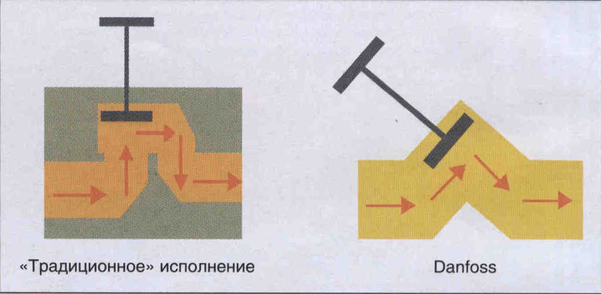 Вентили SVA характеризуются очень высоким коэффициентом Kv. Специалисты компании «Данфосс» провели испытания запорных вентилей трех ведущих фирм - производителей аналогичного оборудования. Результаты испытаний представлены на рис. 3 и 4. Особенно высокий коэффициент Kv у проходных запорных вентилей SVA объясняется оптимальным расположением штока вентиля (рис. 5).
