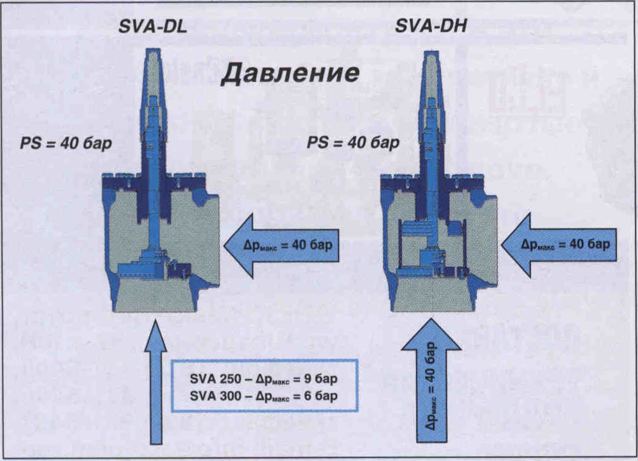 Вентили SVA большого диаметра (Ду более 250 мм) представлены двумя сериями - SVA-DL и SVA-DH (рис. 6). Вентили SVA-DL используют в том случае, если перепад давлений не превышает 9 бар. Вентили серии SVA-DH имеют систему внутреннего выравнивания давления, которая позволяет открыть вентиль даже при перепадах давлений, достигающих 40 бар!