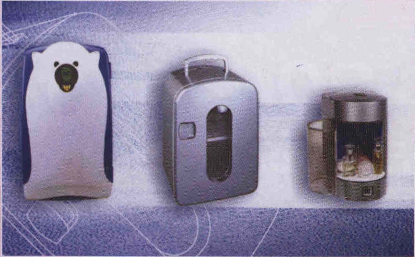 Белорусские холодильники “Атлант” в основном двухкомпрессорные и поэтому проигрывают литовским по стоимостным показателям (второй компрессор вызывает удорожание примерно на 10 %). Высокий уровень качества изготовления холодильников “Атлант” и экономичность в эксплуатации (класс “А”) создают престиж марке и позволяют белорусам держать цены на уровне европейских аналогов (“Атланты” конкурируют с итальянскими и турецкими холодильниками). В 2003 г. минчане впервые освоили термоэлектрические холодильники емкостью 31 л в двух модификациях с вентилятором охлаждения термоэлектрических пластин и без вентилятора (рис. 6). В 2004 г. они представили на суд покупателей комбинированные холодильники-морозильники с электронным управлением и цифровой индикацией температур в камерах и необычным наружным дизайном под названием “волна”. Ассоциации с волной вызывают выпукло-вогнутые лицевые поверхности дверей и волнообразные очертания ручек (рис. 7).