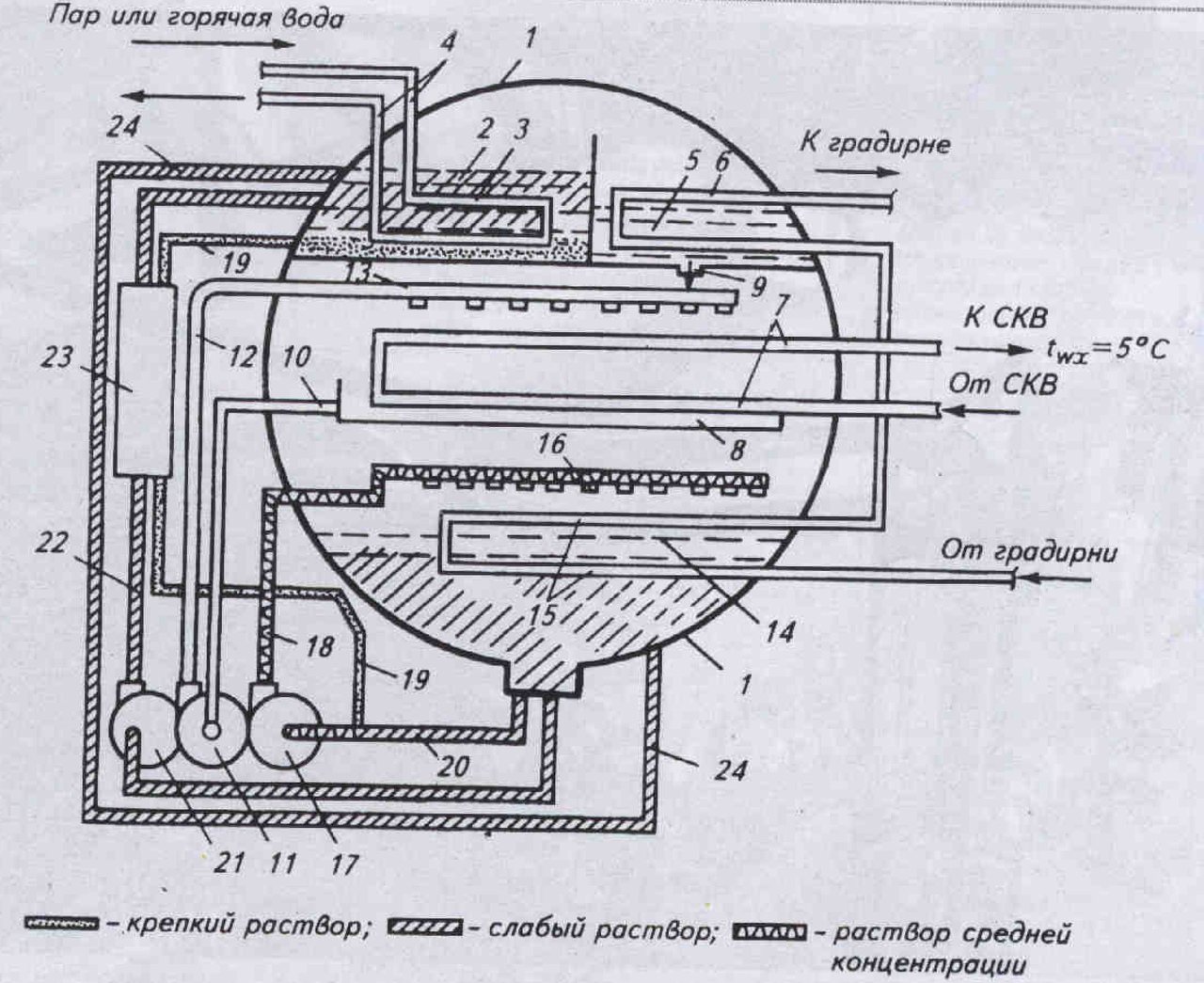 В нижней части корпуса 1 расположен абсорбер 14, где размещен трубчатый теплообменник 15, в трубки которого подается охлажденная в градирне вода. Над теплообменником 15 смонтированы распределительные орошающие сопла 16, через которые насосом 17 по трубопроводу 18 подается раствор средней концентрации. Требуемая концентрация распыляемого в абсорбере 14 раствора обеспечивается смешением перед насосом 17 крепкого раствора, поступающего по трубопроводу 19, и слабого раствора, идущего по трубопроводу 20. В нижней части корпуса 11 поддерживается низкое давление (8 мм рт.ст.), при котором вода испаряется при температуре 5 °C, отводя теплоту от воды, охлаждаемой в трубках теплообменника-испарителя 7. Поддержание низкого давления в абсорбере 14 обеспечивается поглощением образующихся водяных паров раствором средней концентрации, распыляемым через орошающие сопла 16 на поверхность теплообменника 15.