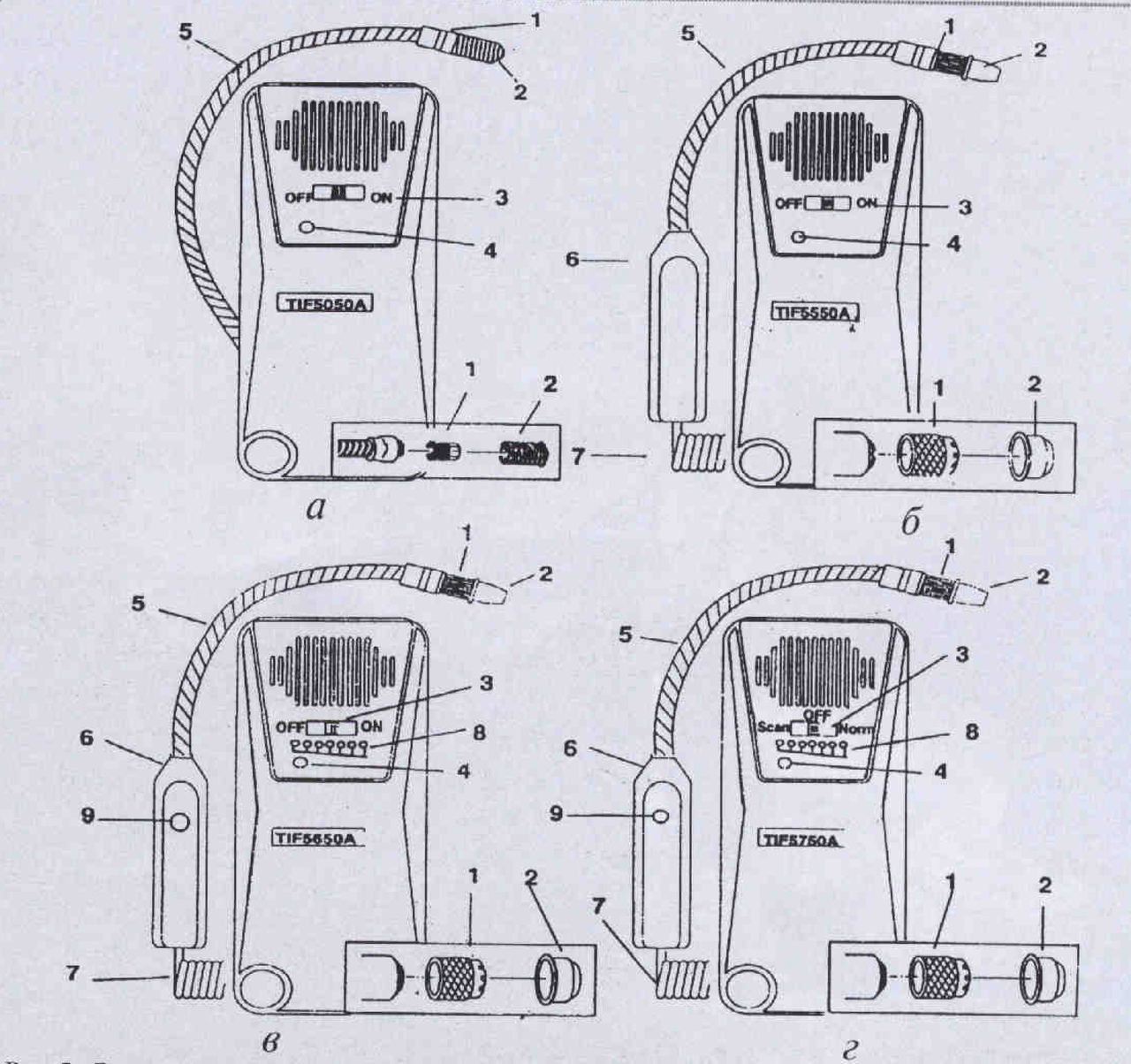 Рис. 2. Электронные течеискатели фирмы REFCO:а -TIF5050; б-TIF5550; в-T1F5650; г-TIF57501 — чувствительный элемент; 2 — защитный колпачок; 3 — выключатель; 4 — индикатор; 5 — гибкий провод; 6 — ручка со встроенным насосом; 7 — витой провод; 8 — индикатор интенсивности утечки; 9 — кнопка перезапуска (отсечки фона)
