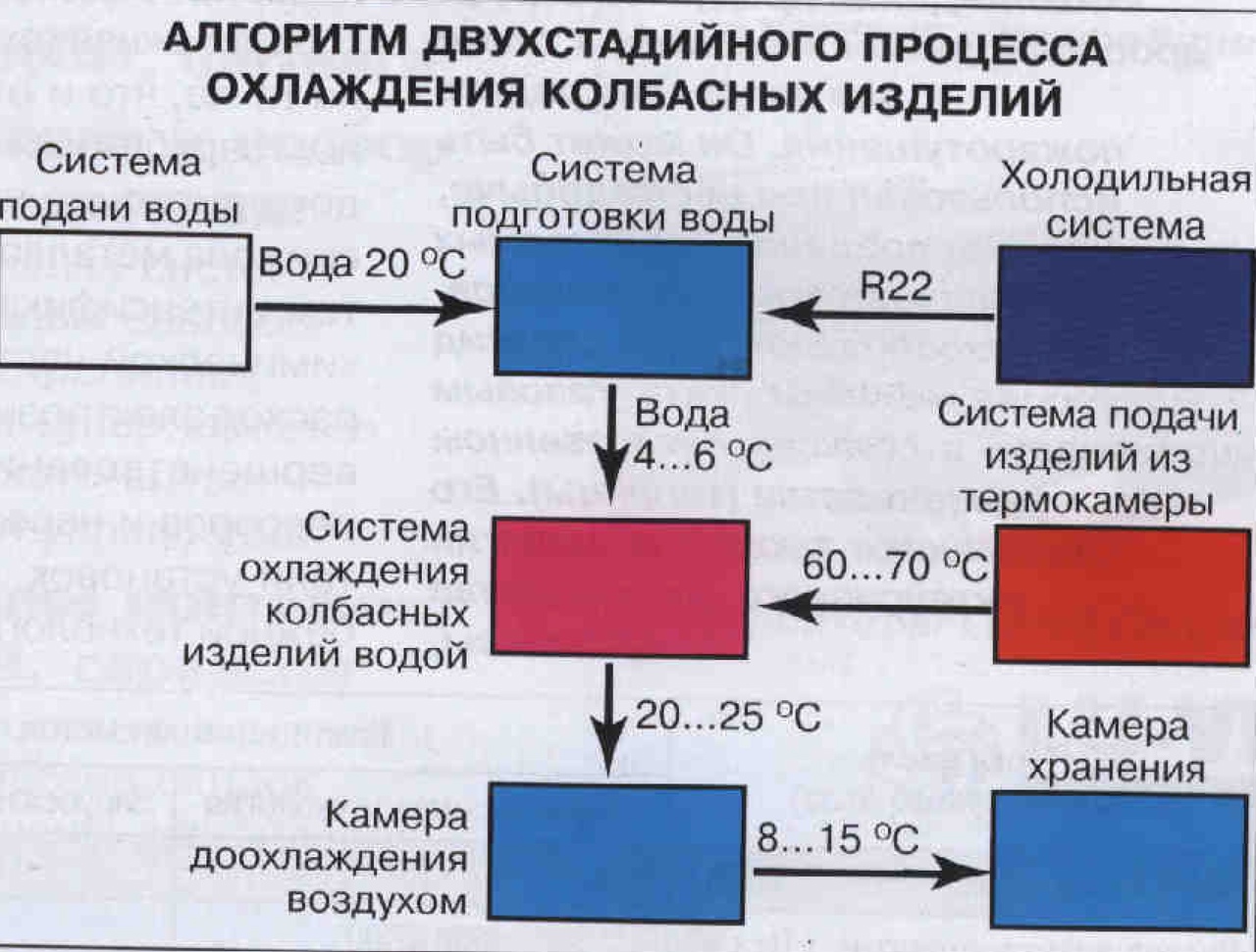 Технологический процесс производства колбасных изделий, сосисок и сарделек предусматривает обязательное их охлаждение с 60... 70 °C после термической обработки до 8... 15 °C перед реализацией.