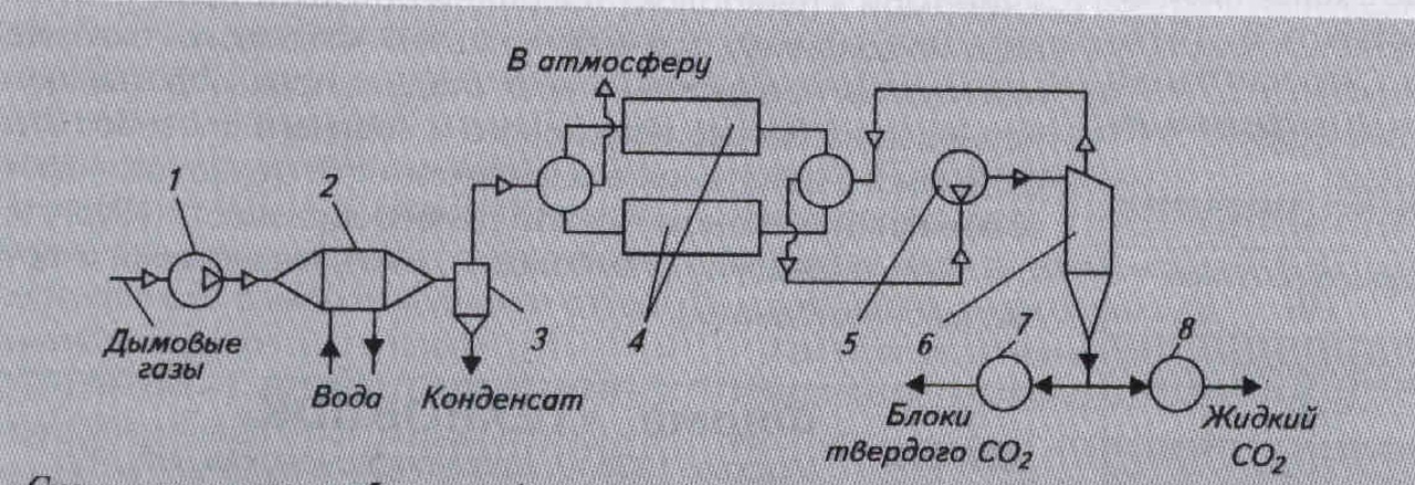Рассмотрим схему установки с использованием сбросных дымовых газов. Охлажденная газовая смесь сжимается до 0,3 МПа в компрессоре (см. рисунок), охлаждается в водяном теплообменнике 2 с удалением водяного конденсата в каплеуловителе В парных регенераторах 4 газовая смесь охлаждается до температуры! насыщения диоксида углерода. При расширении газовой смеси в турбо-детандере 5 диоксид углерода кристаллизуется и в виде кристаллической пыли отделяется от потока в сепараторе 6. Снегообразный диоксид углерода либо прессуется в блоки npecсователем 7, либо ожижается в ожижителе 8. Холодный газовый поток возвращается в один из генераторе для охлаждения насадки, а затем вы водится из контура машины.