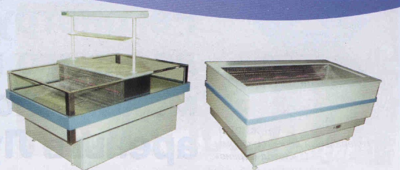 Островные холодильные витрины (бонпеты) «Метель-0,30» (справа) и «Метель-0,40» с двумя независимыми охлаждаемыми объемами и возможностью раздельной регулировки температуры, предназначенные для магазинов самообслуживания