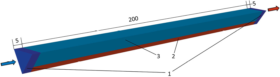 2. Fig. 1. Geometry of the computational domain: 1―end regions of methane gas phase; 2―methane gas phase zone in the flow part; 3―the adsorbent region.