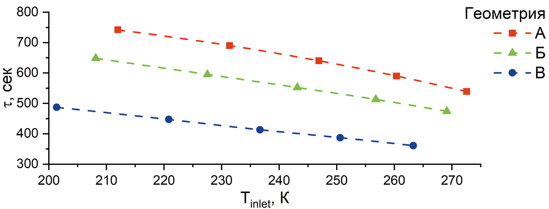 Полученные зависимости имеют преимущественно монотонно–убывающий характер с ростом температуры и свидетельствуют о сокращении продолжительности заправки при сочетании высоких температур и давлений. В случае геометрии А увеличение температуры на 1 градус в среднем позволило сократить продолжительность заправки на 3,2 с, а в случае геометрий Б и В – на 2,7 и 2 с соответственно. С увеличением диаметра и соответственно площади поверхности центрального отверстия также происходит сокращение продолжительности заправки. Причем с увеличением диаметра с 2 до 4 мм продолжительность заправки сократилась в среднем на 84 с, или на 13%, а с увеличением диаметра с 4 до 6 мм − на 138 с, или на 25%, т. е. эффект почти в 2 раза больше, что может обусловливаться существенным повышением гидравлического сопротивления адсорбционного блока геометрии А. В случае уменьшения диаметра канала с 6 до 4 мм (в 1,5 раза) и роста потери давления по его длине с 50 до 260 Па (в 5,2 раза) доля потока через слой адсорбента увеличилась с 2 · 10-3 до 3 · 10-3 кг/ч (в 1,5 раза), а в случае уменьшения диаметра канала с 4 до 2 мм (в 2 раза) и роста потери давления с 260 до 4260 Па (в 16,4 раза) доля потока через слой адсорбента увеличилась с 3 · 10-3 до 0,224 кг/ч (в 74,7 раза). Полученные результаты свидетельствует о существенном повышении интенсивности охлаждения с торцевой поверхности со стороны входящего потока в случае геометрии А по сравнению с геометриями Б и В.