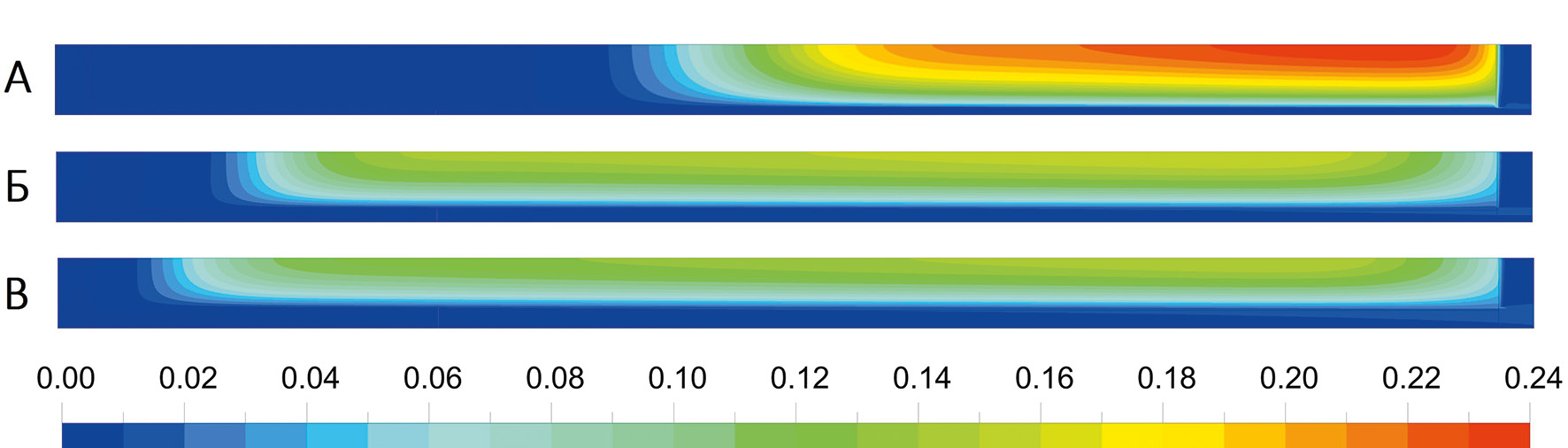 Рис. 4. Температурные поля в безразмерном виде θ для геометрий А, Б и В при давлении 35 бар в момент заполнения адсорбента на 95 % от предельного значения. / Fig. 4. Temperature fields in the dimensionless form θ for geometries A, B, and C at 35-bar pressure at the adsorbent filling of 95% of the limit value.