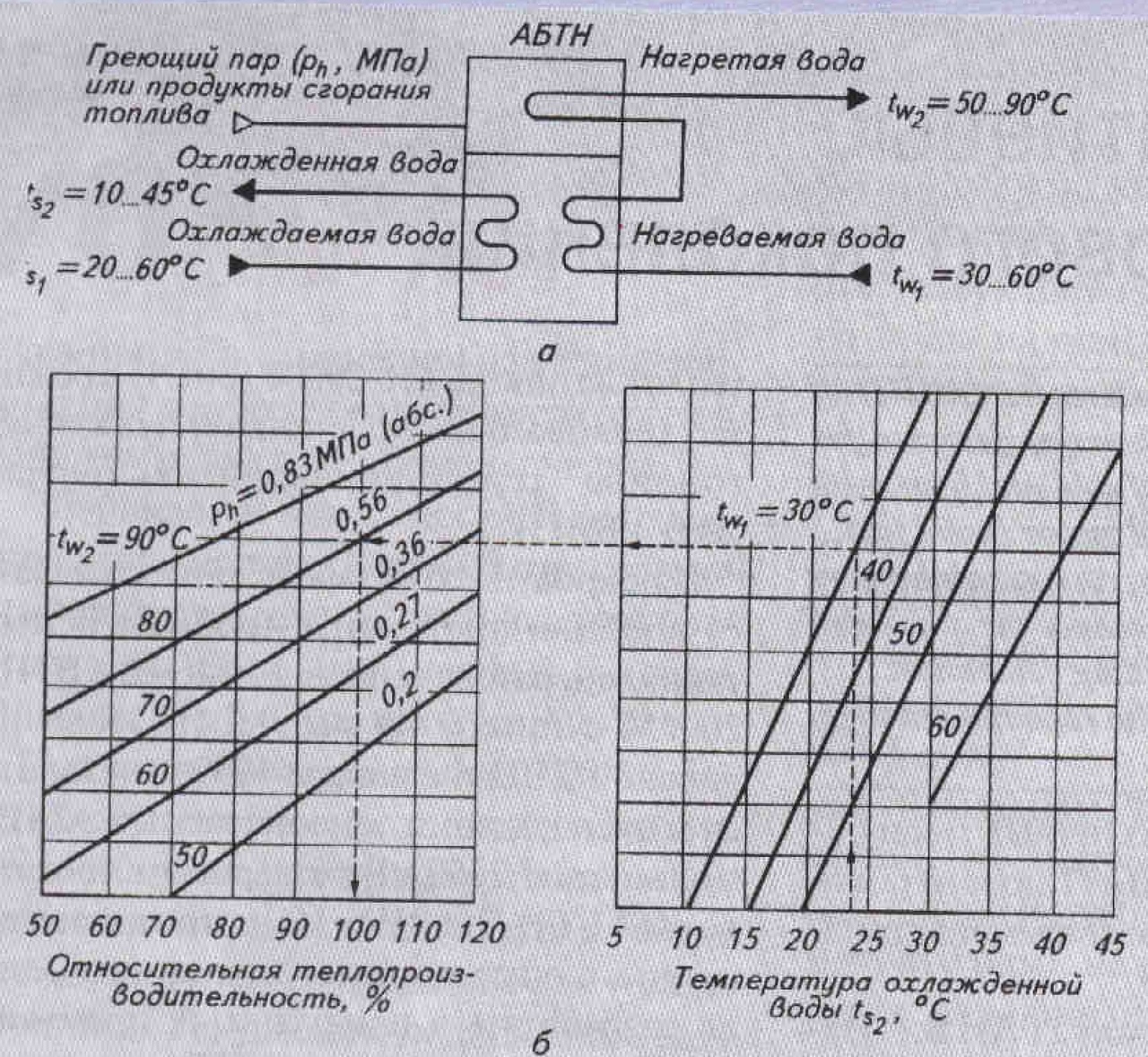 Рис.2. Схема подключения к АБТН внешних источников теплоты (а) и зависимости относительной теплопроизводительнисти АБТН от параметров внешних источников теплоты (б)