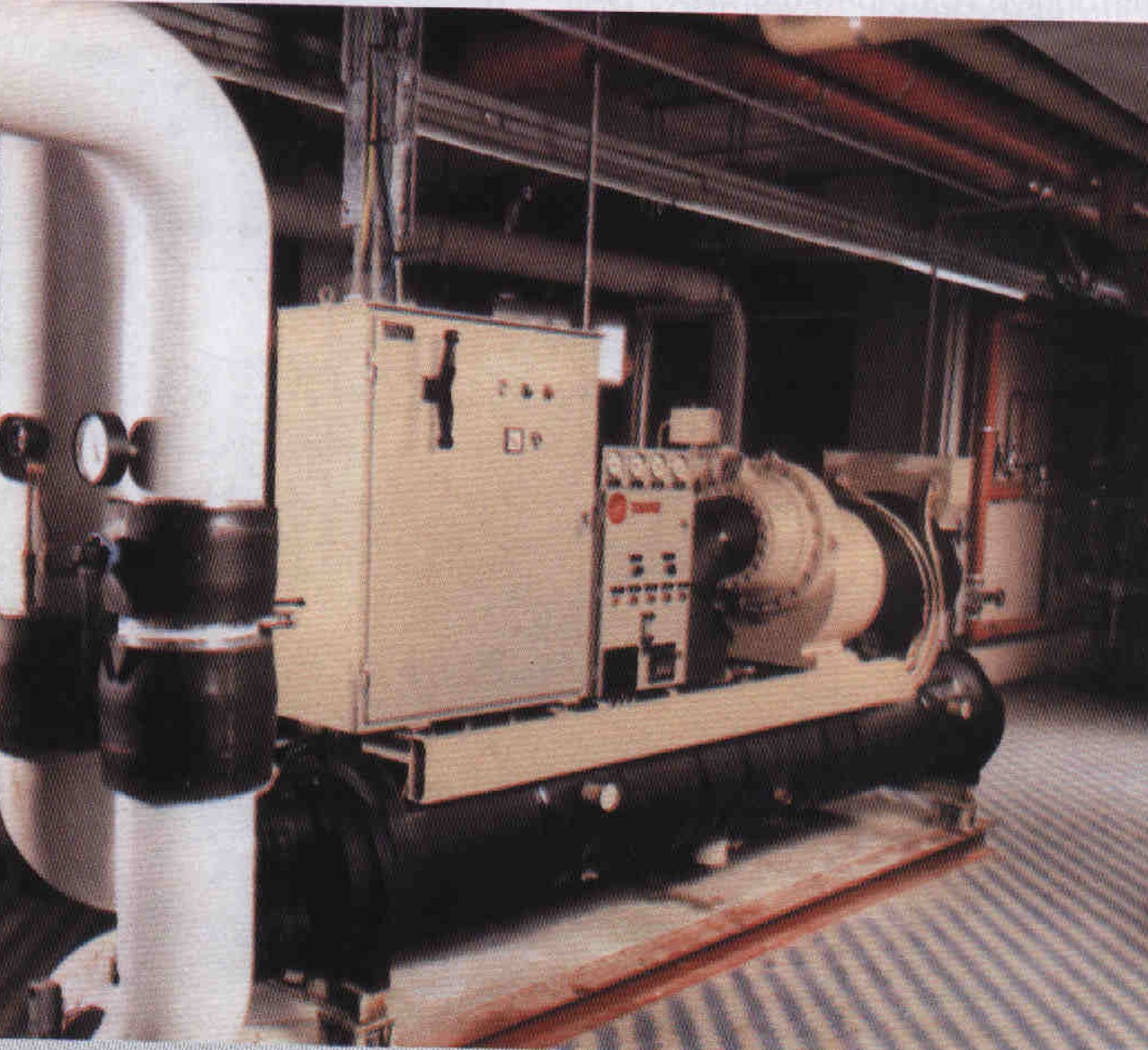 По проекту, разработанному под руководством С.С.Амирджанова, в машинном зале площадью 310 м2 были установлены две холодильные машины типа CVGE56-KC-PC холодопроизводительностью r расчетном режиме 2000 кВт каждая производства фирмы «Трейн» (рис.1).