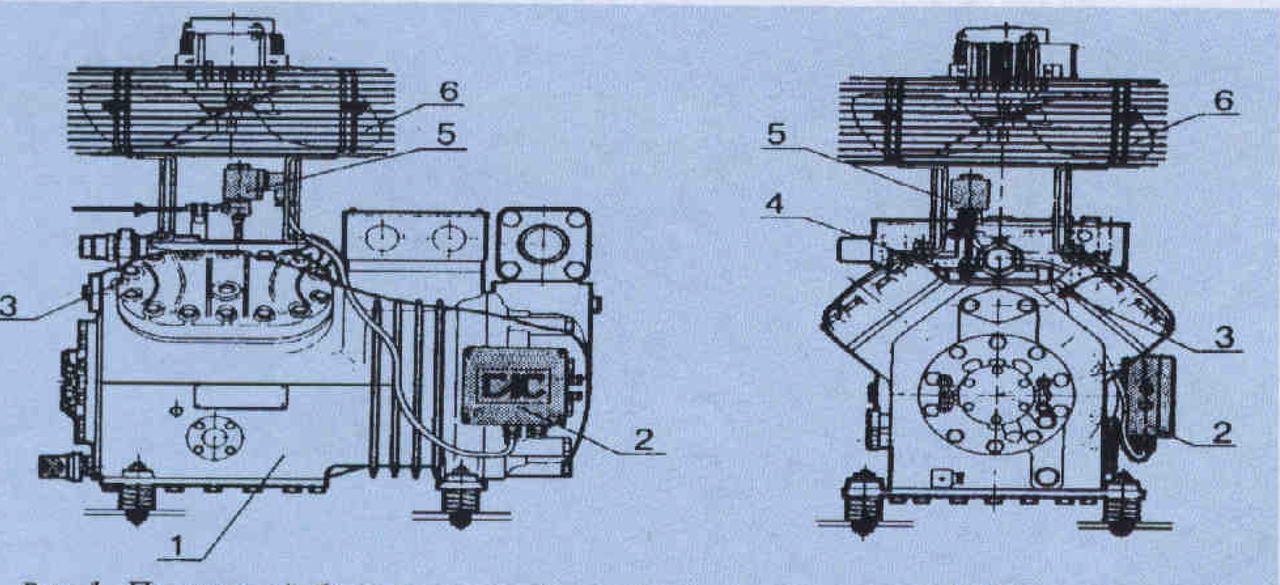 Основное назначение системы С1С заключается в непрерывном контроле за температурой нагнетания и сравнении ее с максимально допустимым значением с помощью блока управления. R случае превышения этою значения. устанавливаемого заранее, жидкий хладагент впрыскивается во всасывающую полость компрессора (минуя электродвигатель) и с помощью специальной форсунки 4 направляется па наружную поверхность горячих стенок цилиндров. Точная дозировка хладагента обеспечивается импульсным электромагнитным клапаном 5. Жидкий хладагент, испаряясь, охлаждает рубашки цилиндров и одновременно снижает температуру поступающею со стороны электродвигателя всасываемого перегретого пара, смешиваясь с ним. После падения температуры впрыск хладагента прекращаемся и возобновляется лишь в случае необходимости. В сочетании с интенсивным обдувом наружной поверхности компрессора такая схема позволяет поддерживать температуру пара, выходящего из компрессора на требуемом уровне.