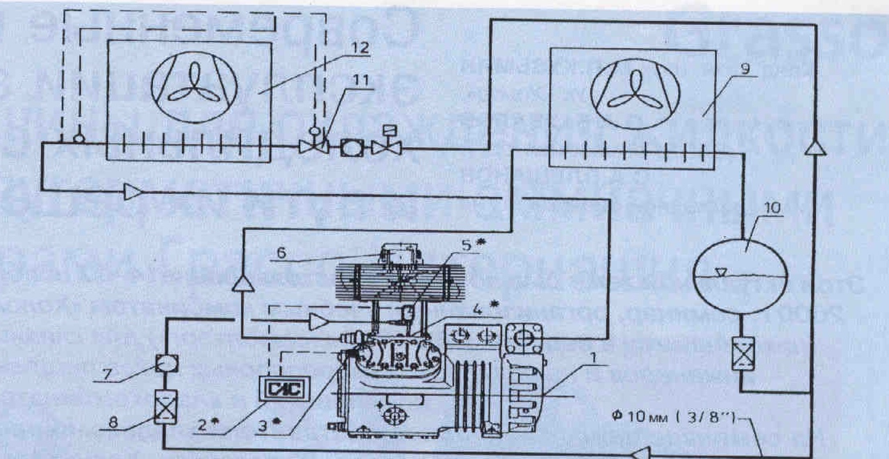 Рис.З. Принципиальная схема холодильной машины с одноступенчатым поршневым компрессором, оборудованным системой С/С: 1 — компрессор; 2 — блок управления системой С/С; 3 — датчик температуры нагнетания; 4 форсунка впрыска жидкого хладагента: 5 — импульсный электромагнитный клапан; 6 — дополнительный вентилятор обдува головки блока компрессора; 7 — смотровое стекло; 8 — фильтр тонкой очистки; 9 - конденсатор; 10 - жидкостный ресивер; 11 - терморегулирующий вентиль (ТРВ); 12 - испаритель. Звездочкой отмечены элементы, относящиеся к системе С/С