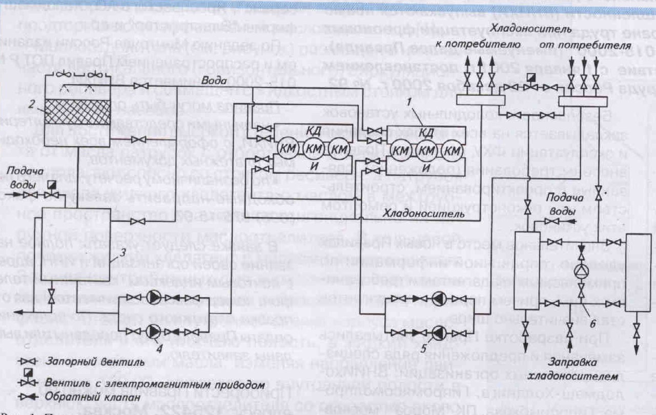 Рис. 1. Принципиальная схема центральной холодильной станции: 1-холодильная машина; 2 — градирня; 3 водяной бак; 4 — блок насосов оборотной воды; 5 — блок насосов хладоносителя; 6 — система подготовки хладоносителя КМ — компрессор; КД — конденсатор; И — испаритель