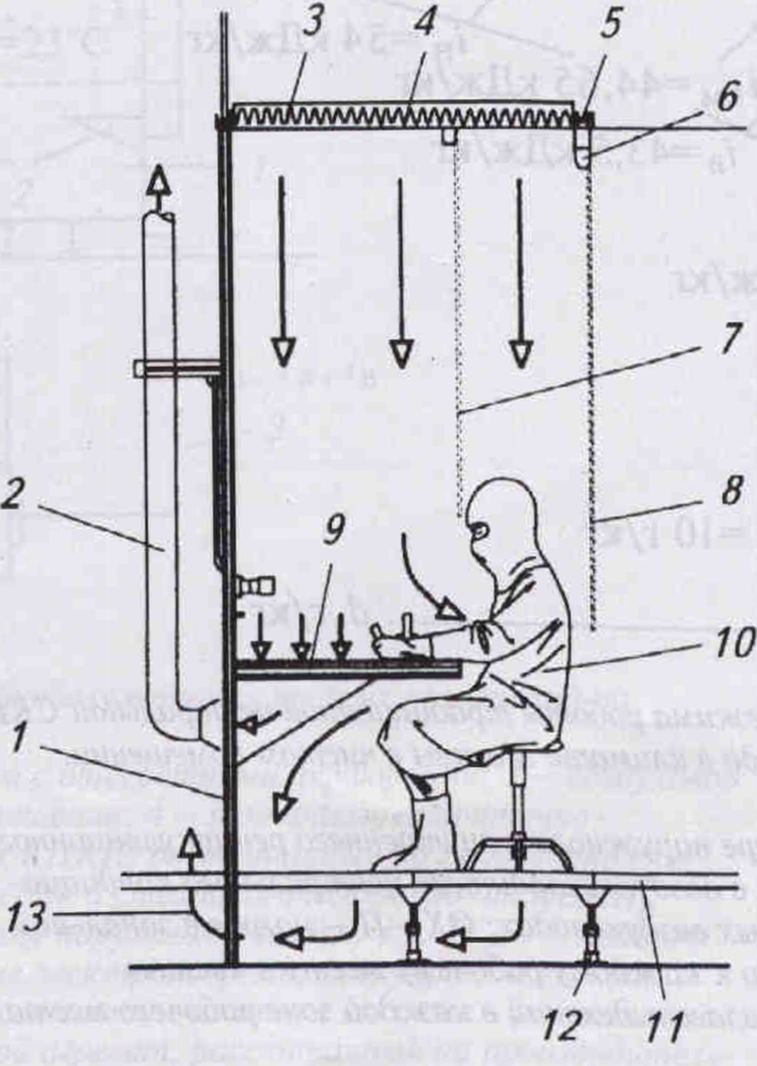 Рис. 1. Организация индивидуального рабочего места для изготовления электронных деталей в чистом помещении: 1 — вертикальная модульная панель из двойных стальных листов с тепловой изоляцией между ними; 2 — вытяжка производственных вредностей от рабочего места; 3 — кассеты концевого фильтра; 4 — фильтрующий материал класса «абсолютный фильтр», собираемый из специальной бумаги, изготовленной из супертонкого стекловолокна; 5 — потолочная модульная панель с перфорацией; 6 — специальный герметичный светильник; 7 - прозрачный экран для направления приточного воздуха в зону производственного процесса; 8 — прозрачный экран для направления приточного воздуха к работающему; 9 — рабочее место в форме стола с перфорацией; 10 — рабочий в специальной одежде; 11 — половая модульная панель с перфорацией; 12 — стойки для удерживания и виброгашения половых панелей; 13 — вытяжка через перфорацию половых панелей