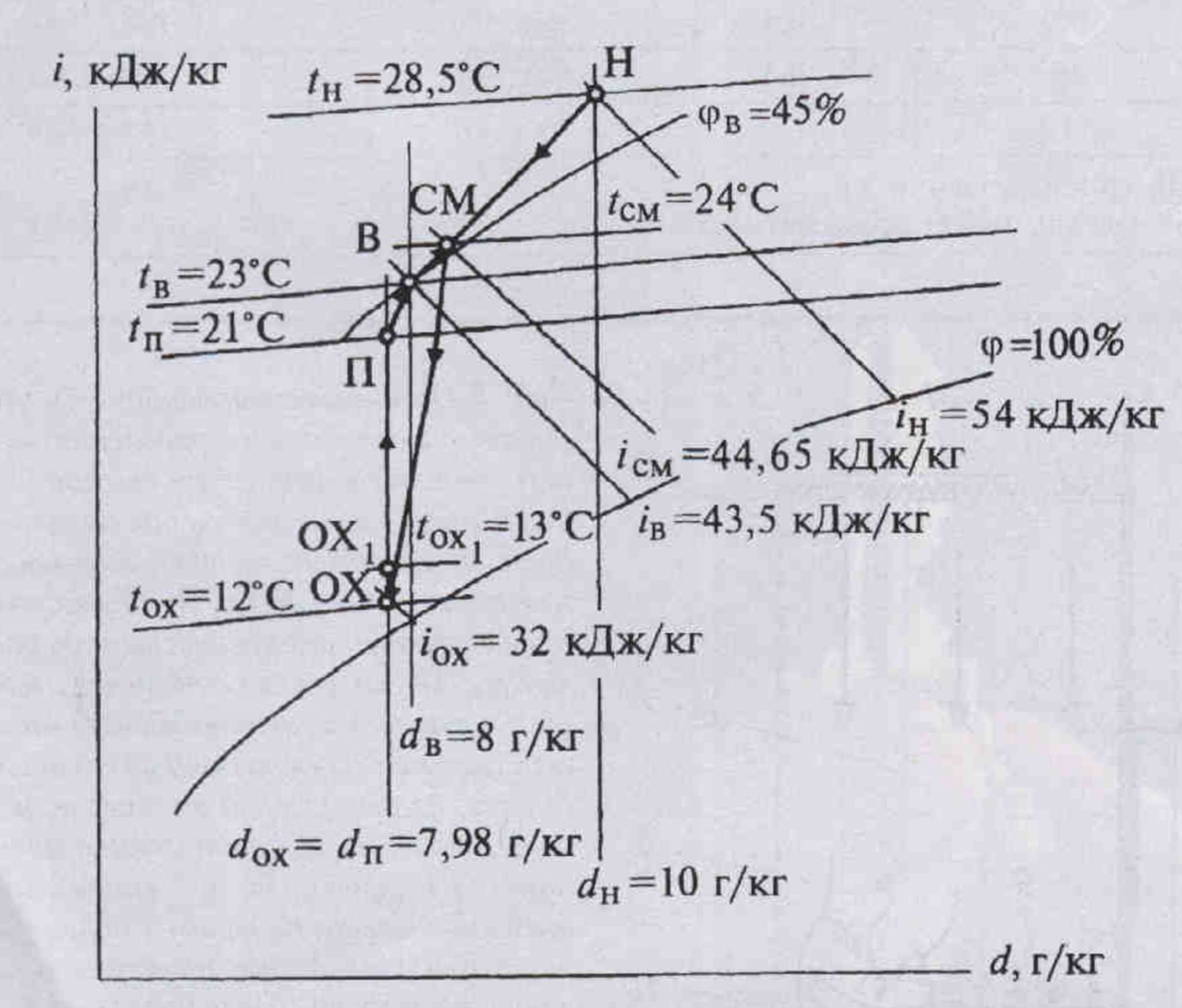 dох = 7,78 г/кг; tох = 11,5 °С; iох =30 кДж/кг; нагрев в приточном вентиляторе и воздуховодах на 1°С; параметры воздуха после нагрева: dохl =7,78 г/кг; tохl = 12,5 °С; iохl = 31 кДж/кг. В вентиляторном агрегате производительностью 30 000 м3/ч смешиваются циркуляционный воздух (точка В) и приготовленный приточный наружный (точка OX1). Параметры смеси приточного воздуха (точка П): tп= 21°С; iп = 40,3 кДж/кг; dп = 7,9 г/кг.