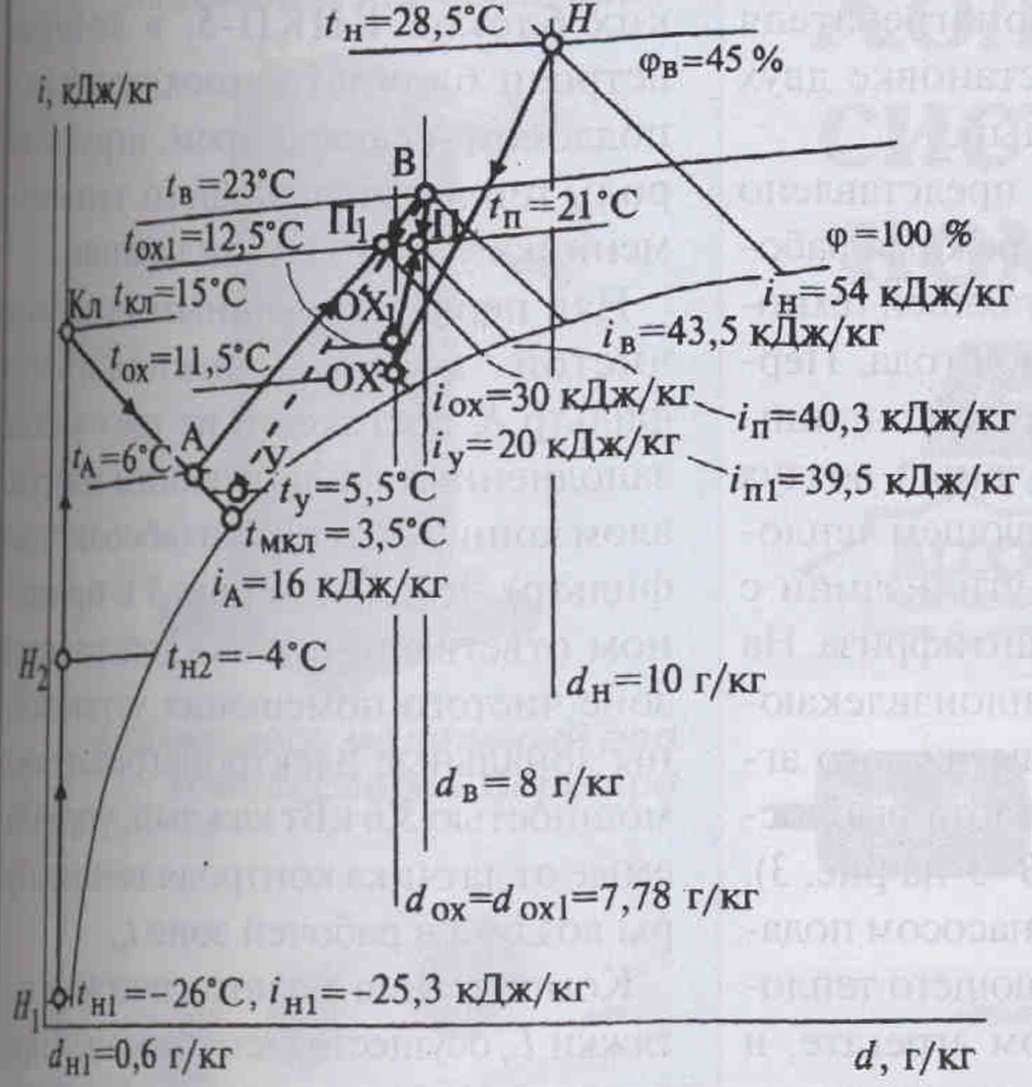 На рис. 3 представлено построение на i,d-диаграмме круглогодового режима работы центральной СКВ по энергосберегающей технологии. Параметры охлажденного и осушенного приточного наружного воздуха: