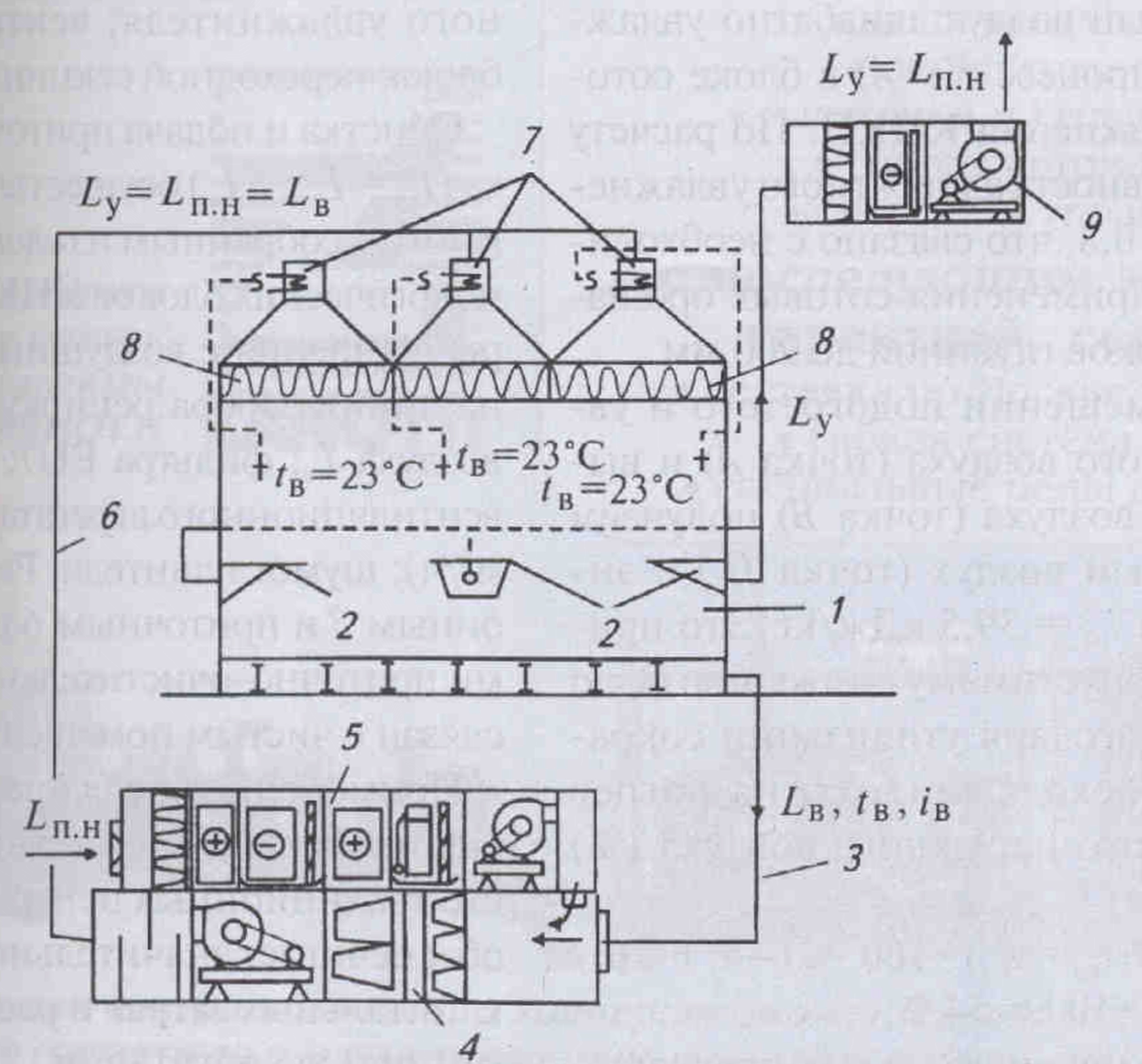 Рис. 4. Принципиальная схема центральной СКВ для обслуживания чистых помещений по энергосберегающей технологии: 1 — чистое помещение; 2 — рабочее место со столом с отверстиями перфорации; 3 — воздуховод рециркуляции воздуха Lв из фальшпола чистого помещения; 4 — центральный приточно-очистительный агрегат из технологических блоков КЦКП, рассчитанный на производительность Lп=Lпн+Lв; 5 — центральный приточный агрегат из технологических блоков КЦКП, рассчитанный на производительность по приточному наружному воздуху Lпн~Lу; 6 — приточный воздуховод к чистому помещению: 7 — концевые электронагреватели, управляемые от датчика контроля температуры tв; 8 — фильтр абсолютной очистки в кассетах, расположенный над перфорированным потолком; 9 – вытяжной агрегат, рассчитанный на производительность по вытяжному выбросному воздуху Ly