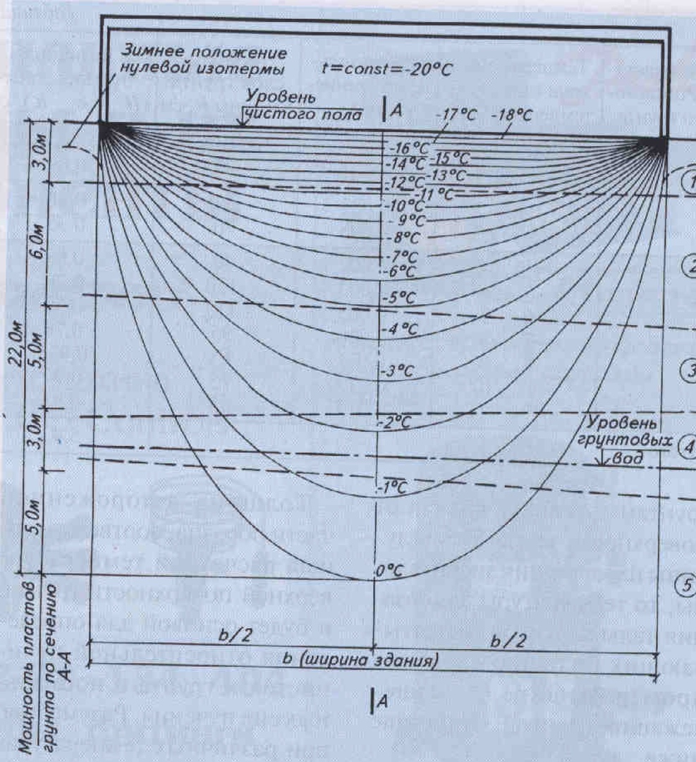 Определение температурного поля представляет собой сложную задачу математической физики. На температурное поле влияют многие фак торы: размеры холодильника в плане; термическое сопротивление пола; тепловой ре жим камер; физико-механические и теплофизические свойства грунта в талом и мерзлом состоянии; темпера тура залога грунта, наличие грунтовой воды, скорость ее перемещения и химический