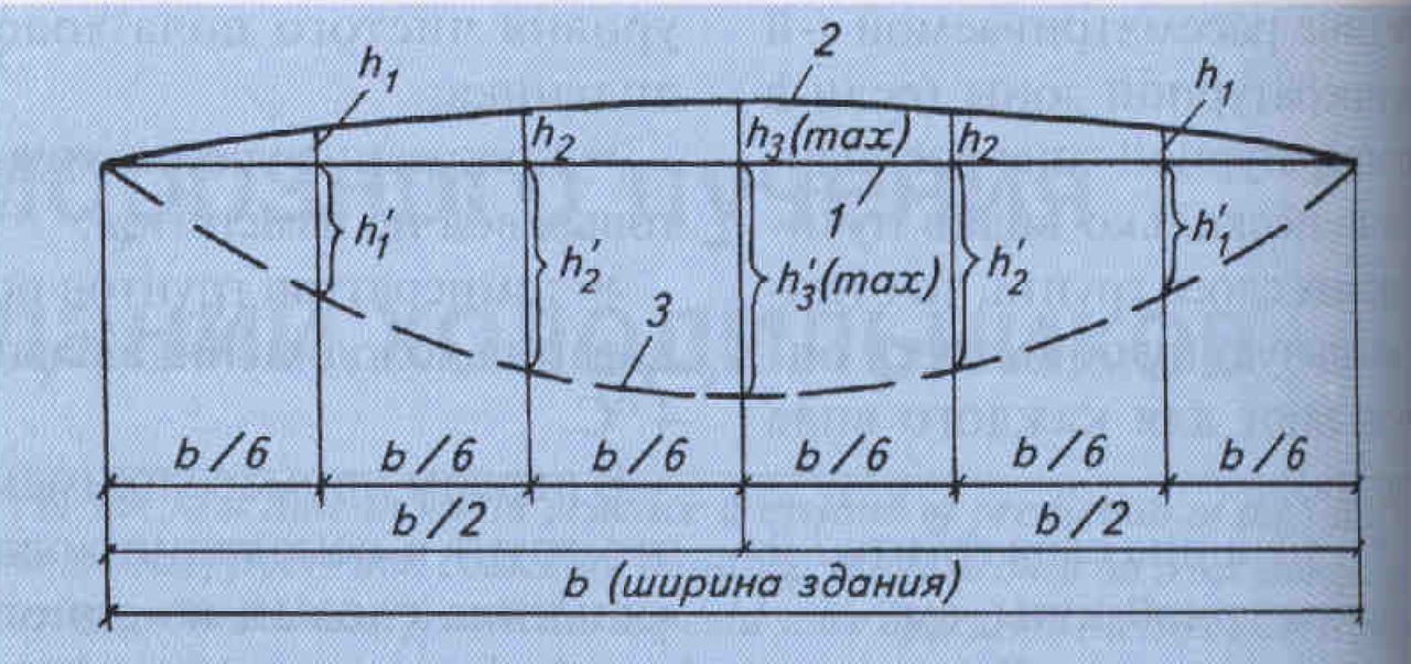 Рис. 2. Схема линий пучения пола и промерзания однородного равномерного увлажненного грунта в основании холодильника при одинаковой отрицательной температуре по ширине здания: 1 — линия пола до промерзания; 2 — линия пучения пола; 3 — линия промерзания грунта