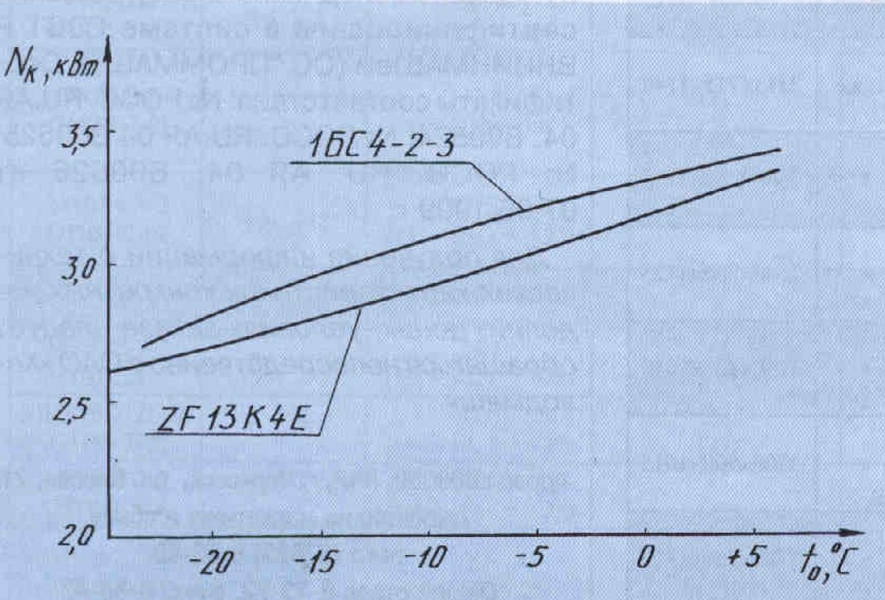 Результаты испытаний компрессора 1БС4-2-3 на R22 даны на рис. 1 и 2. Для сравнения там же приведены характеристики компрессора ZF13K4E фирмы Copeland, взятые из каталога. Как видно из графиков, при температуре кипения хладагента выше -10 °C холодильная машина с компрессором 1БС4-2-3 практически не уступает по холодопроизводительности машине с компрессором ZF13K4E. Потребляемая мощность отечественного компрессора незначительно (на 2-6 %) превышает этот показатель для зарубежного аналога. Параллельно с испытаниями, проводимыми в ЗАО “НИИтурбокомпрессор”, в ОАО «ВНИИхолодмаш-Холдинг» (г. Москва) проходили испытания на калориметрическом стенде второго образца компрессора 1БС4-2-3. Полученные характеристики практически совпали сданными ЗАО “НИИтурбокомпрессор”.